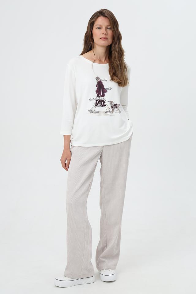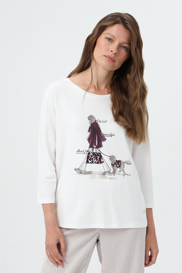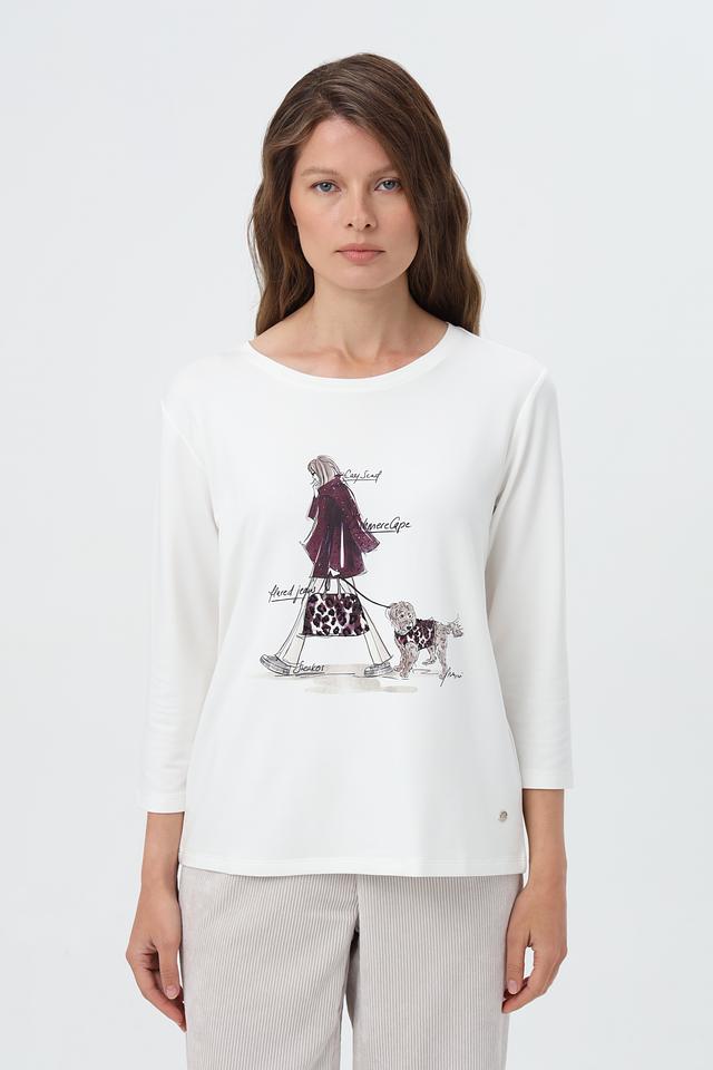 Элегантный лонгслив от бренда Monari станет отличным дополнением к вашему образу. Выполнен в белом цвете и украшен стильным принтом с изображением девушки, выгуливающей собаку.