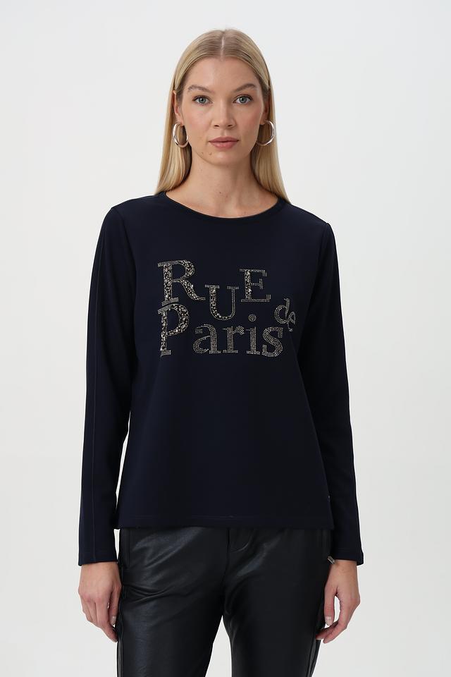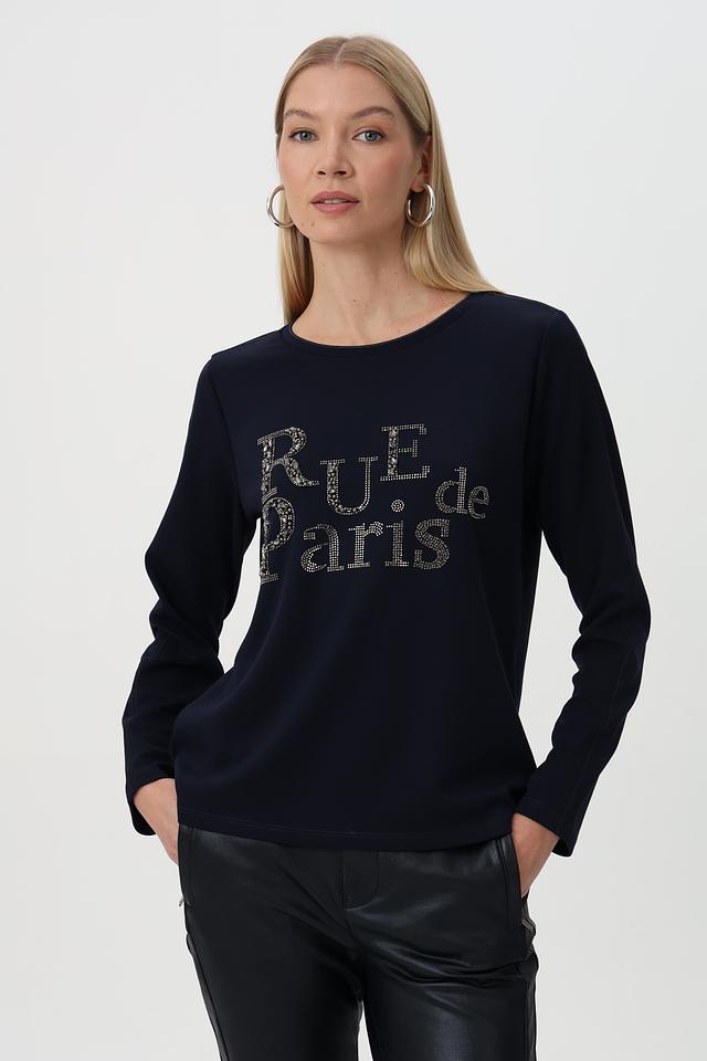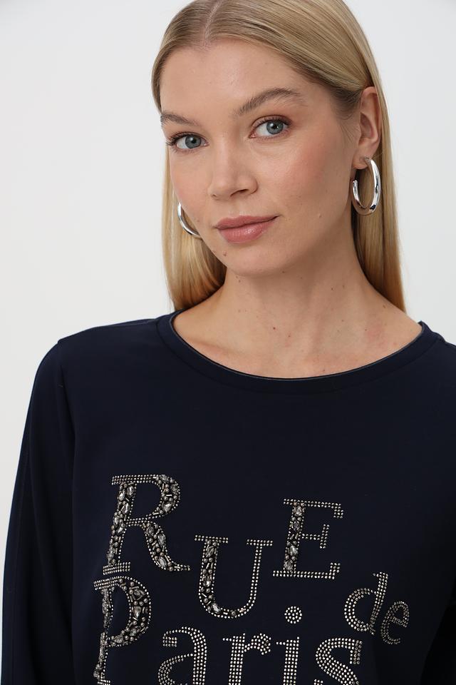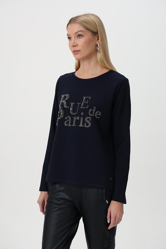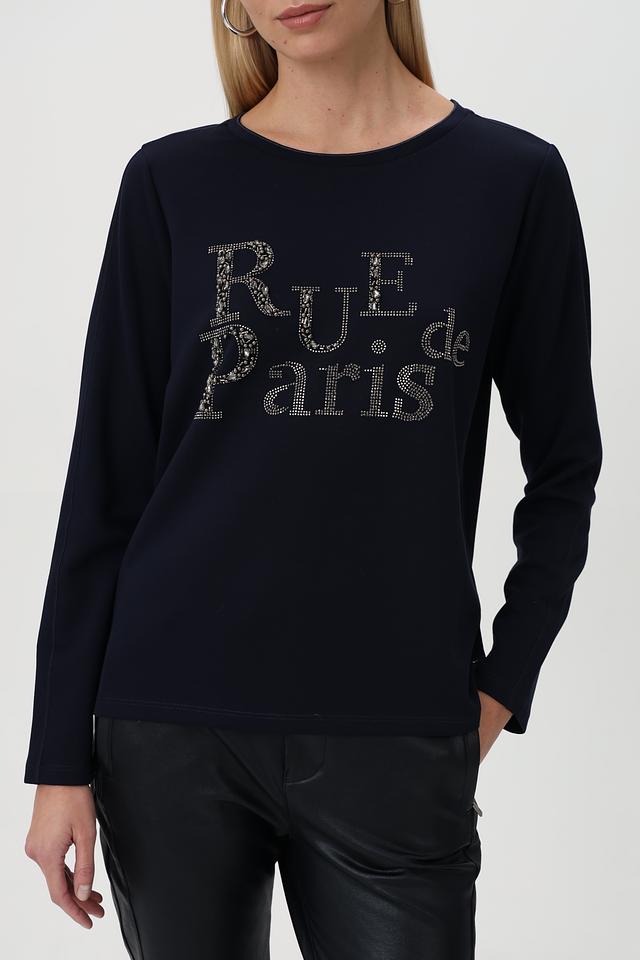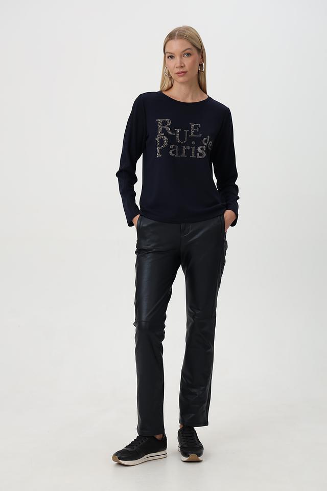 Пуловер имеет прямой крой, длинные рукава и круглый вырез горловины. Особый акцент в этой модели сделан на оригинальный декор из серебристых страз, формирующих надпись "Rue de Paris" на лицевой стороне.