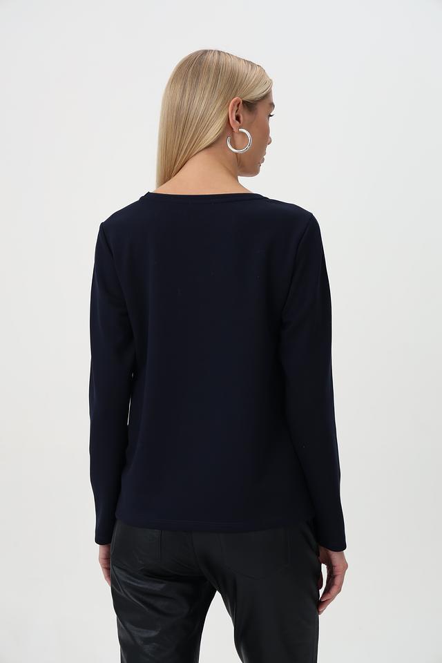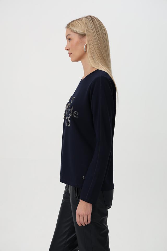 Тёмно-синий пуловер от Monari с эффектным декором из страз. Изготовлен из мягкого трикотажа с добавлением вискозы, полиэстера и эластана для комфорта и хорошей посадки. Состав: полиэстер 55%, вискоза 38%, эластан 7%