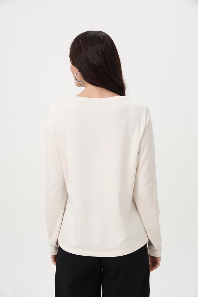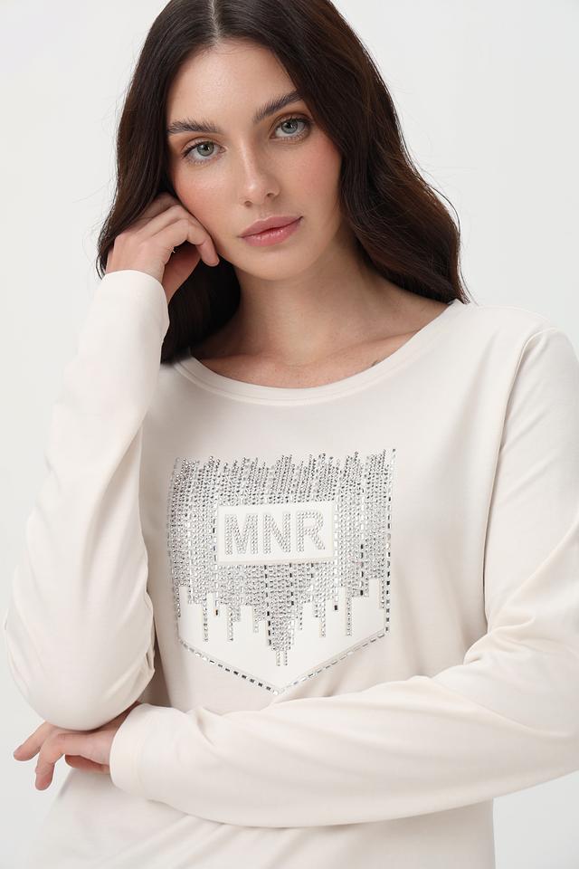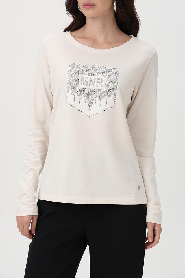 Элегантный лонгслив от бренда Monari станет отличным дополнением к вашему образу. Модель выполнена в нежном бежевом цвете и украшена эффектным принтом с логотипом, выполненным с использованием страз.