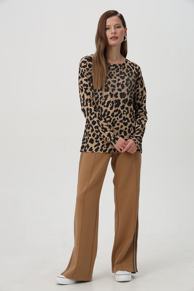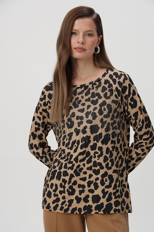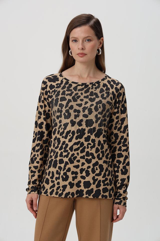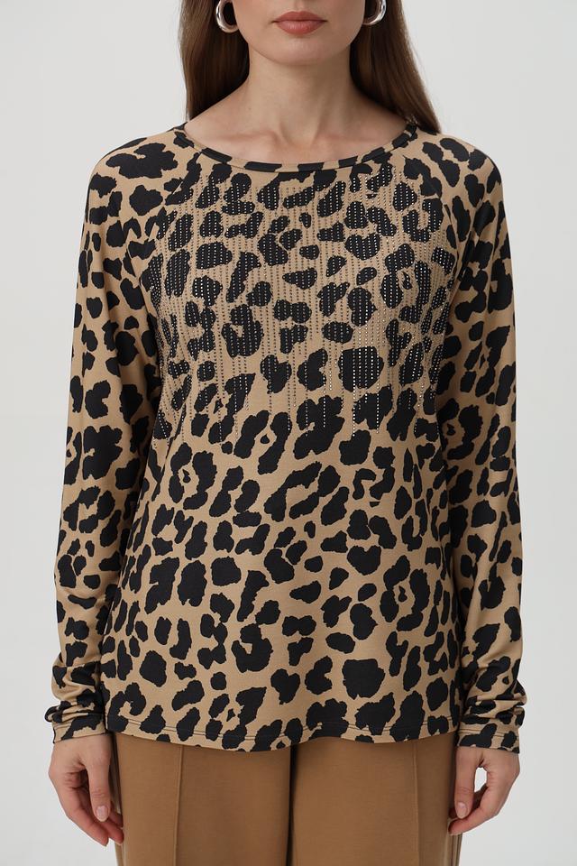 Эта стильная футболка от Monari станет ярким акцентом в вашем образе. Модель выполнена в бежевом цвете с эффектным леопардовым принтом, который придаёт ей современный и трендовый вид.