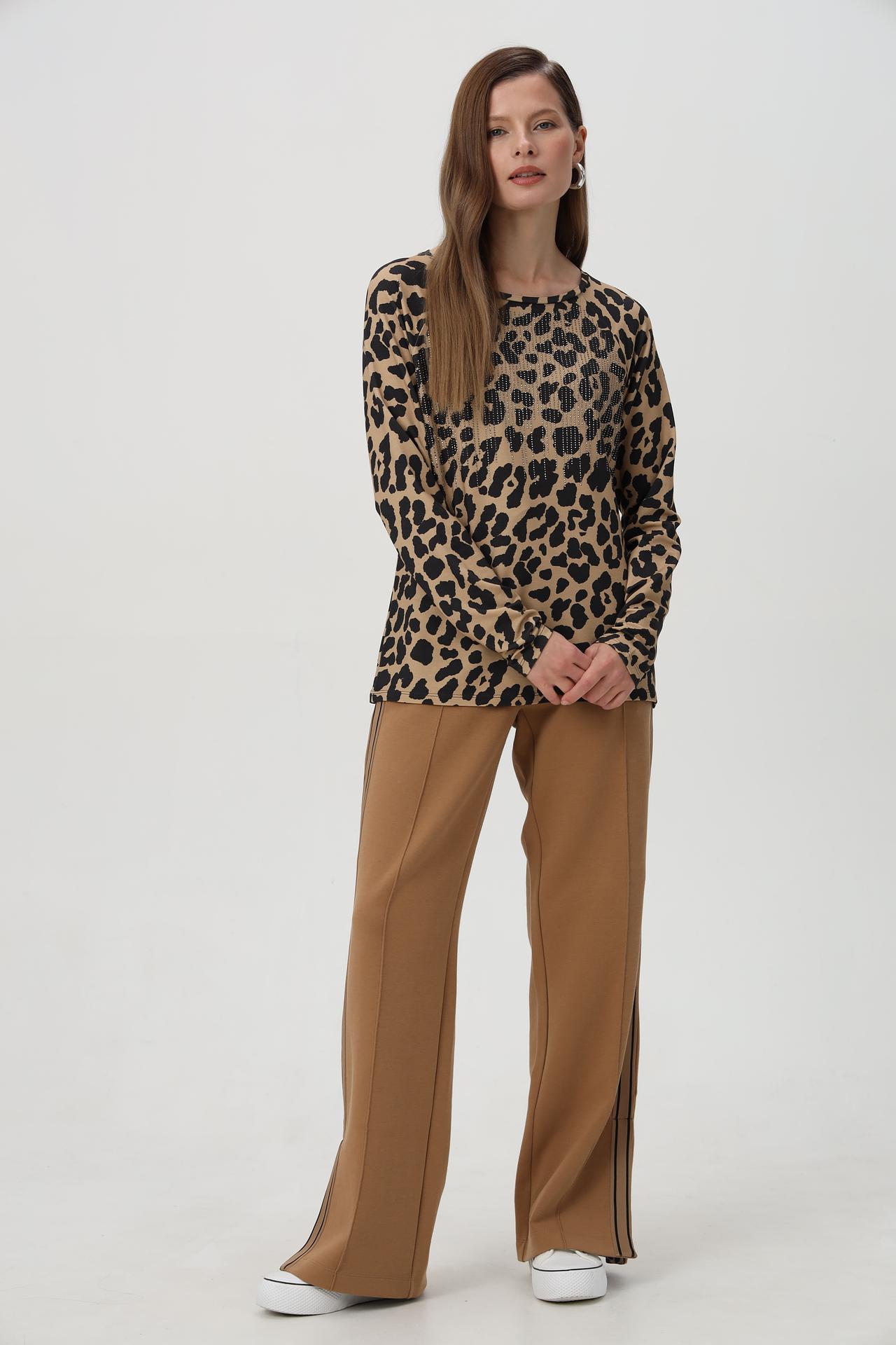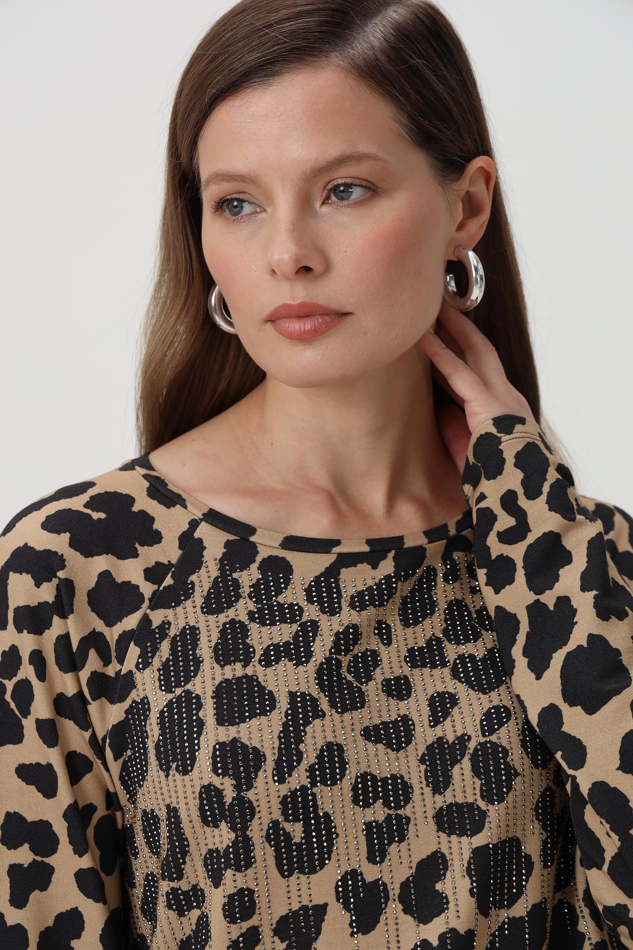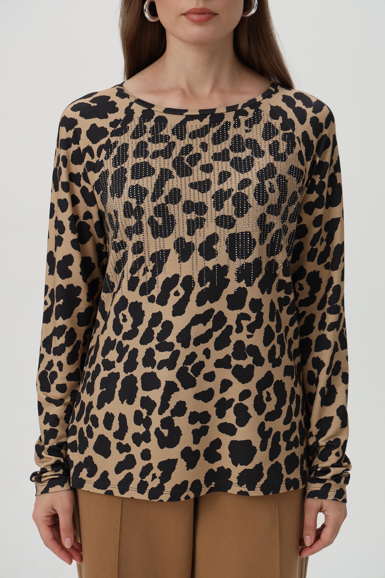 - Дизайн: Оригинальный леопардовый принт, дополненный мерцающими деталями на груди, придает изделию особую изысканность. Круглый вырез и длинные рукава создают классический силуэт.