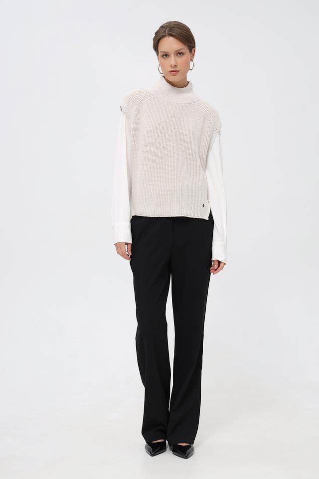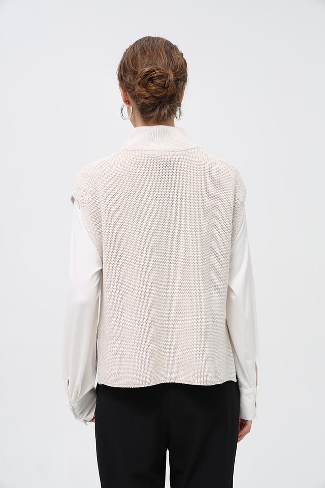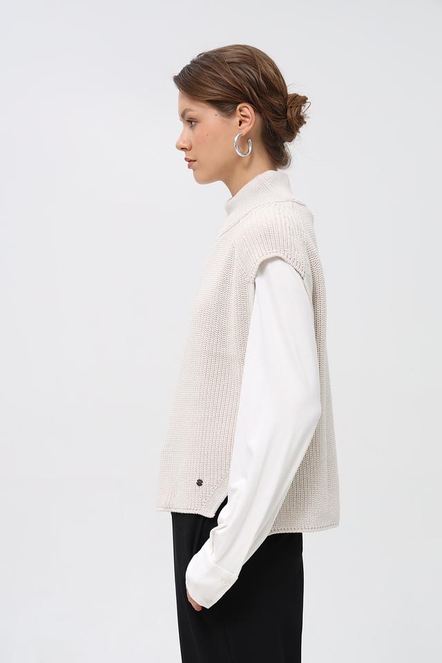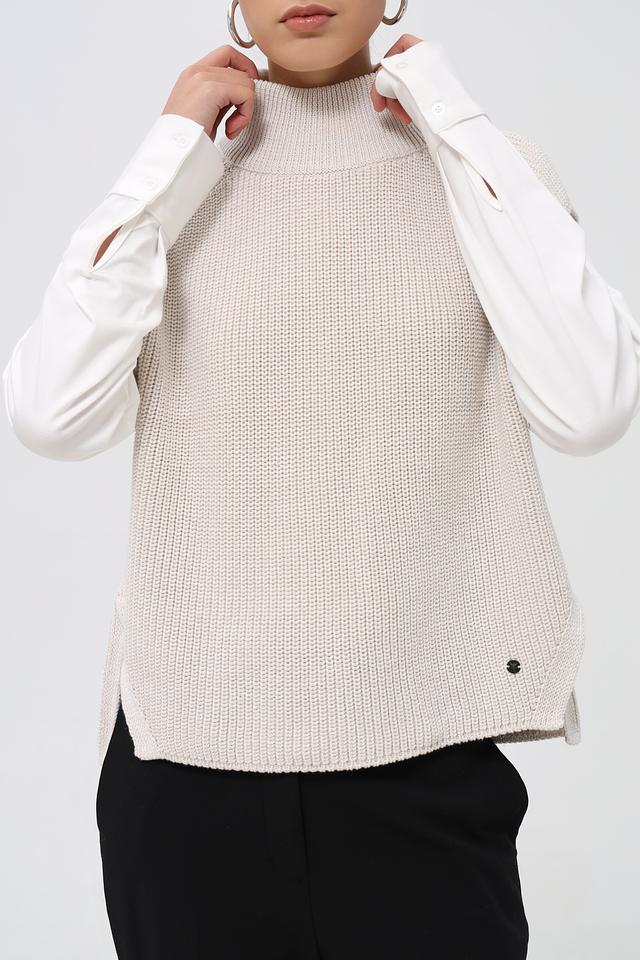 Этот бежевый вязаный жилет от Monari станет отличным выбором для создания многослойных образов. Он имеет удобный высокий воротник и свободный крой, который не сковывает движения.
