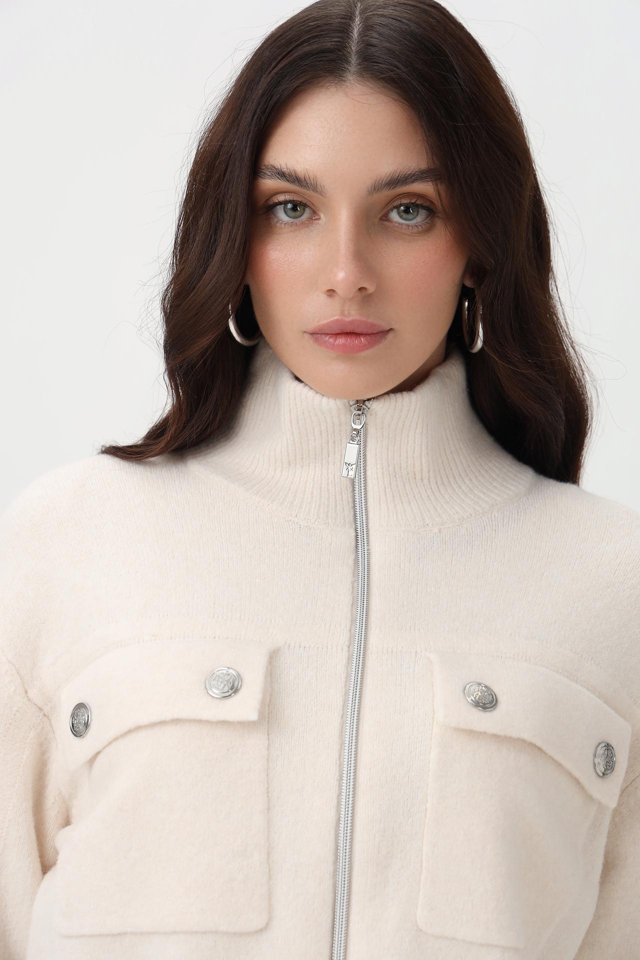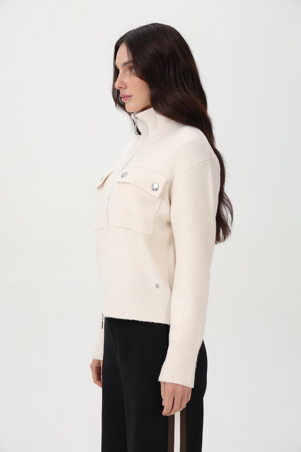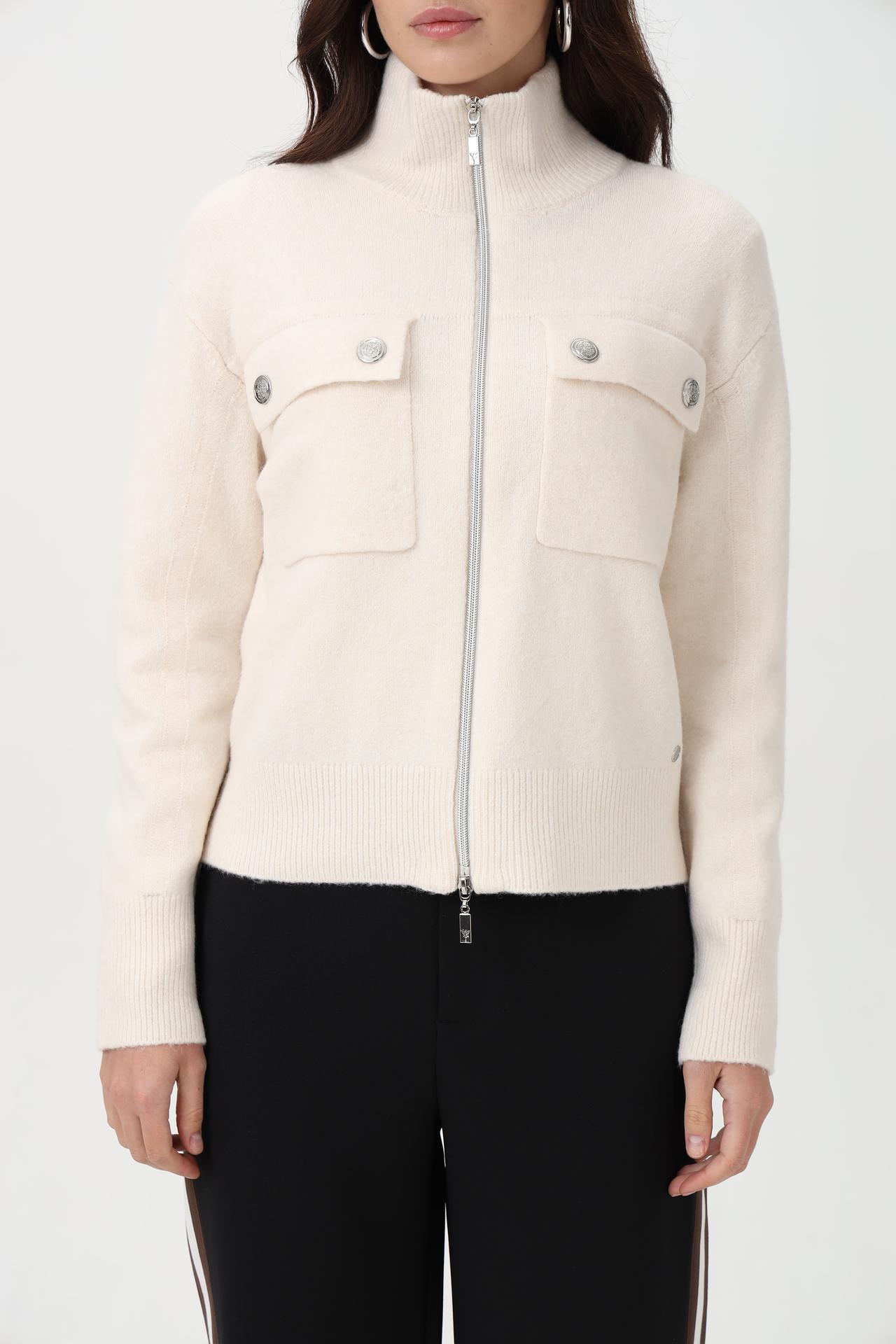 Стильный жакет Monari в бежевом цвете – идеальное дополнение к вашему повседневному гардеробу. Модель с высоким воротником и удобной застежкой-молнией обеспечивает комфорт и тепло. Оригинальные накладные карманы с пуговицами добавляют изделию элегантности и практичности.