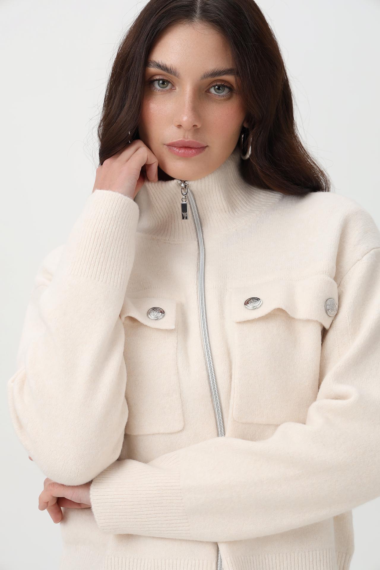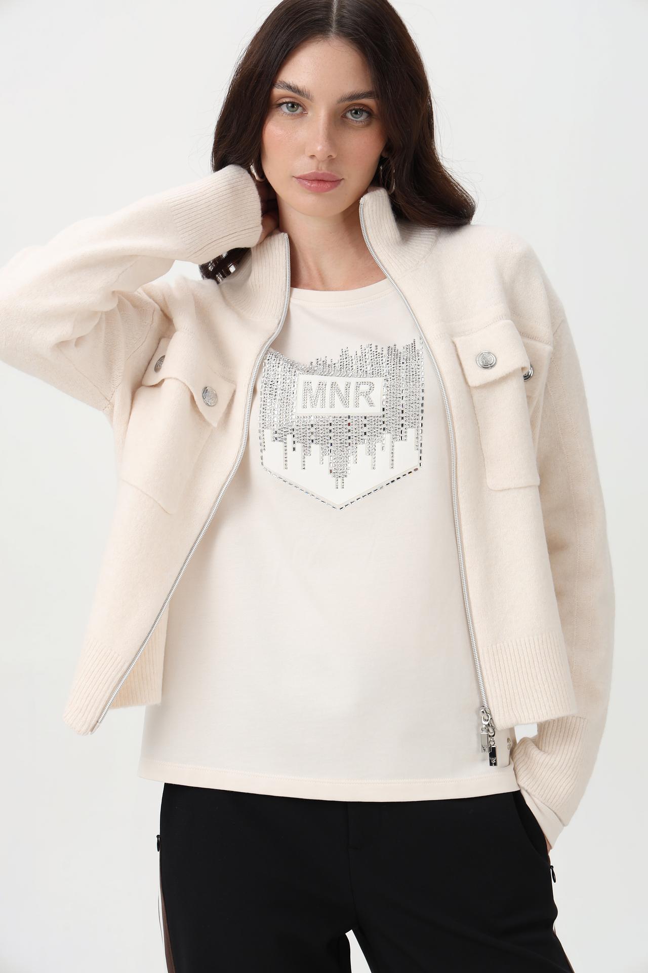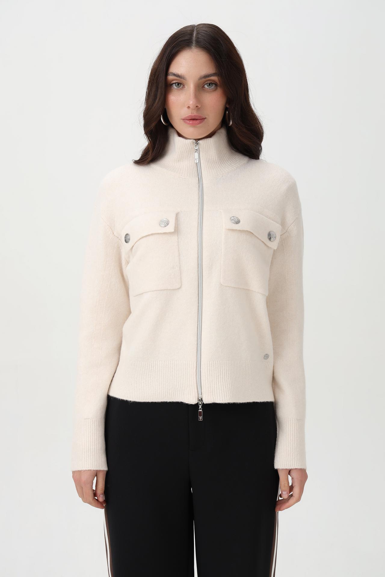 Стильный жакет Monari в бежевом цвете – идеальное дополнение к вашему повседневному гардеробу. Модель с высоким воротником и удобной застежкой-молнией обеспечивает комфорт и тепло. Оригинальные накладные карманы с пуговицами добавляют изделию элегантности и практичности.