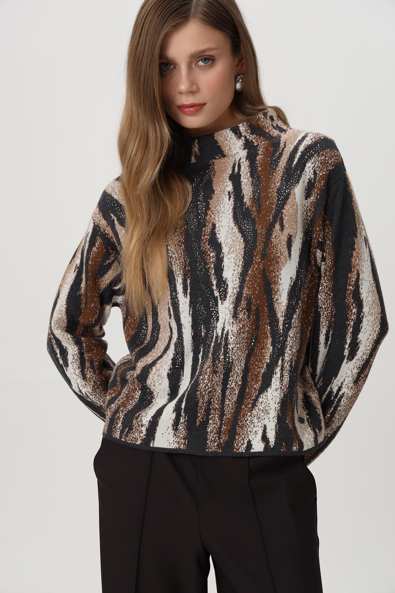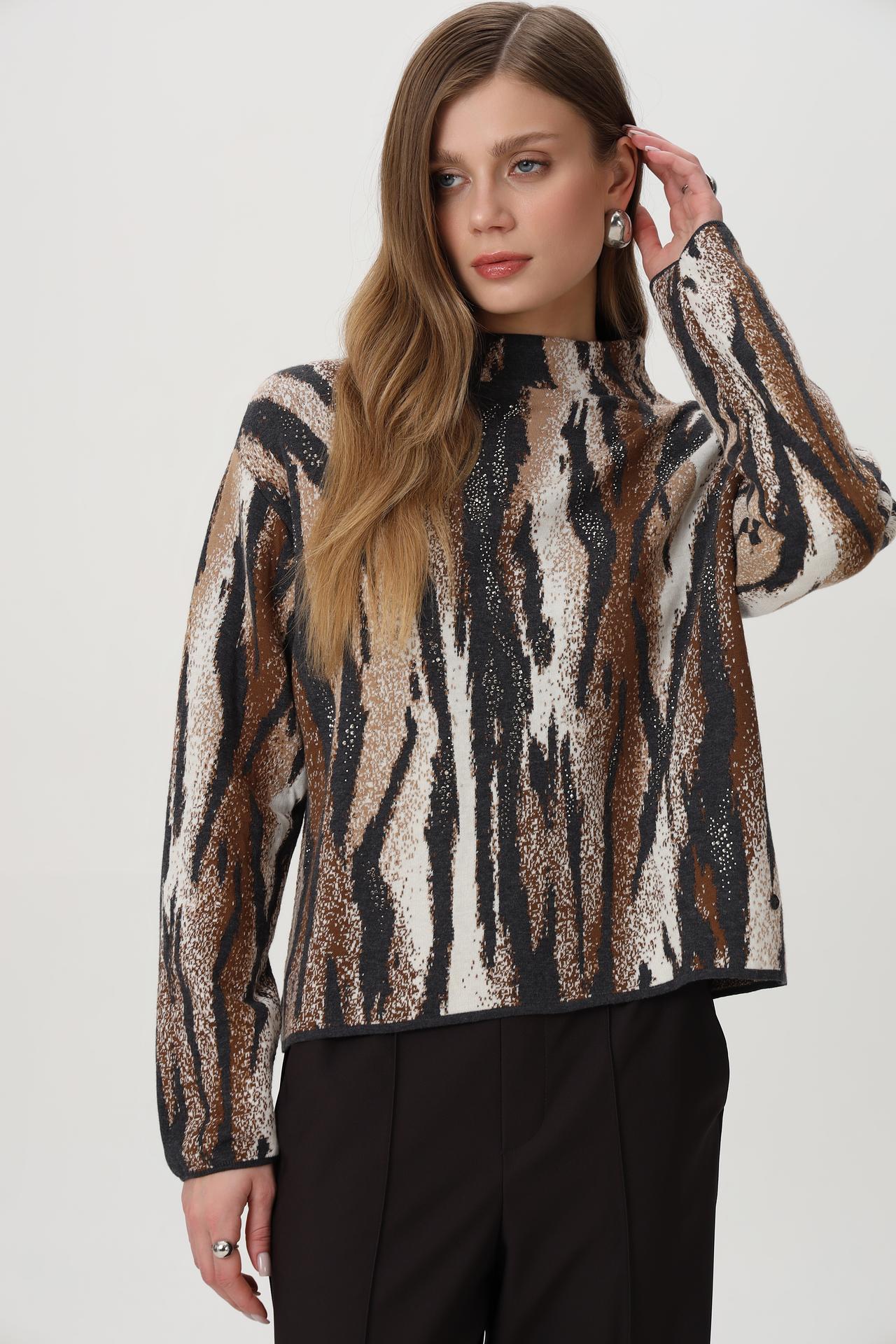 - Дизайн: Оригинальный анималистический принт в сочетании с мерцающими деталями создает эффектный и запоминающийся образ. Высокий воротник-стойка добавляет изысканности.