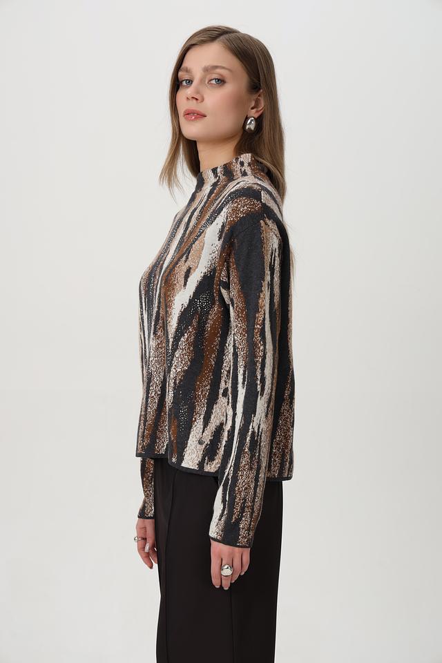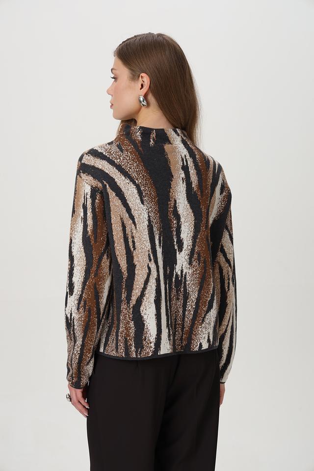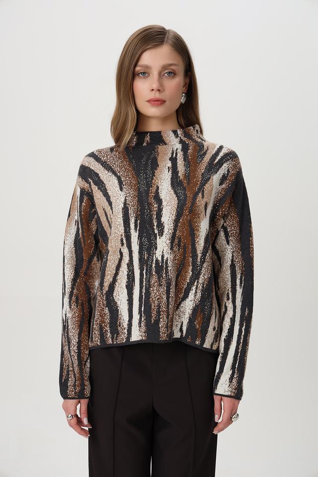 Элегантный пуловер от бренда Monari, выполненный в коричневой цветовой гамме с эффектным принтом. Модель имеет длинные рукава и высокий воротник, что делает её подходящей для прохладной погоды.