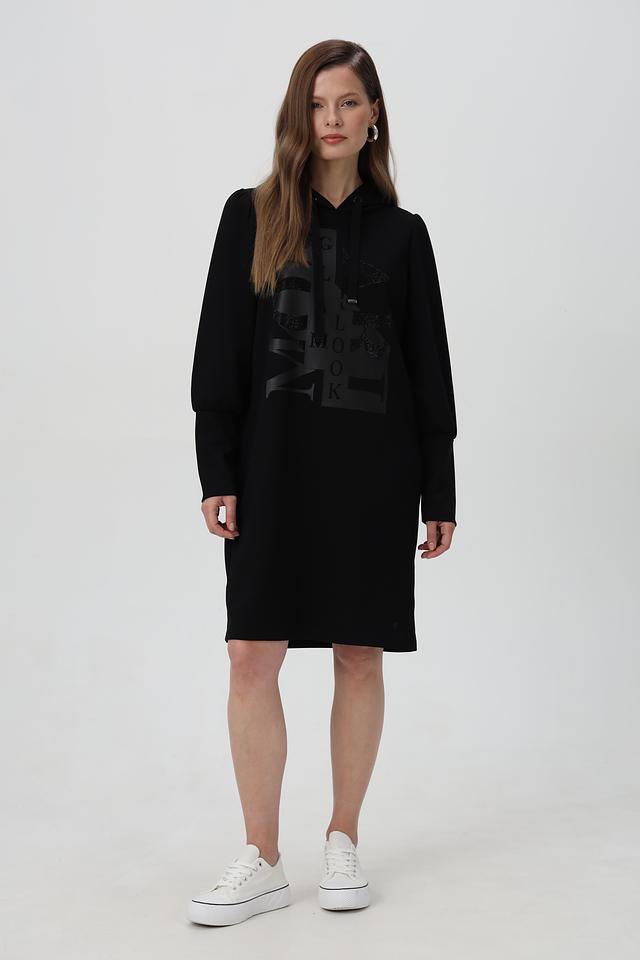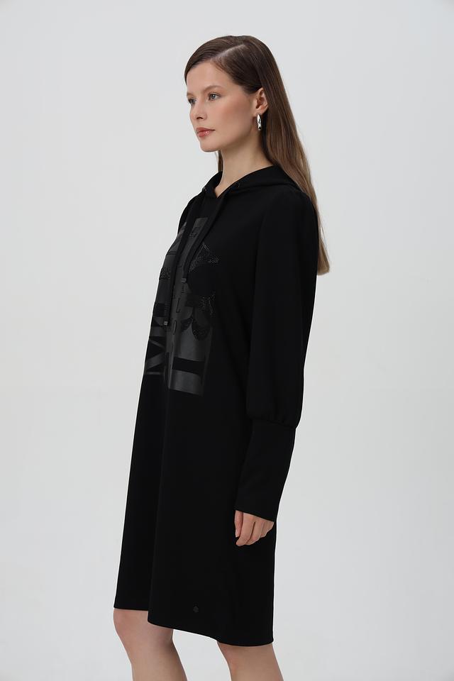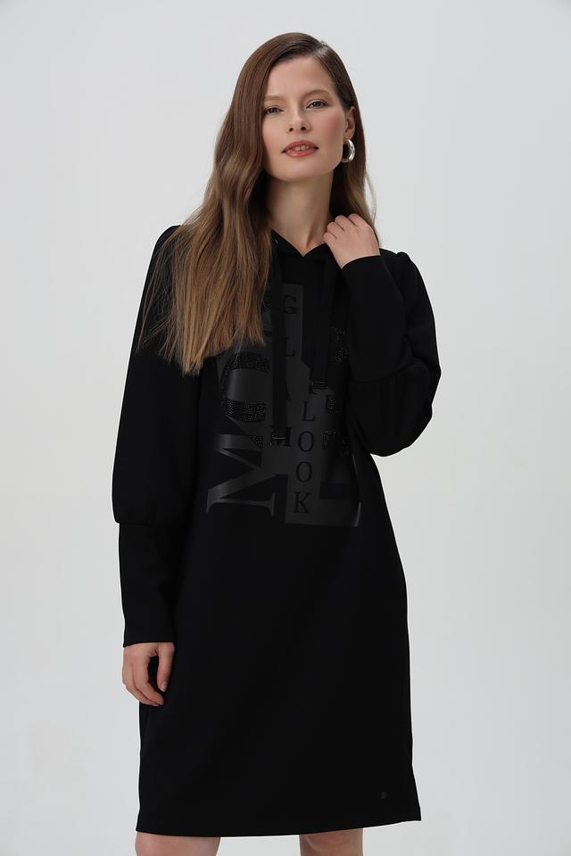 Особенностью модели является оригинальный декор в виде надписи и страз, которые добавляют образу изысканности и привлекательности. Платье имеет удобный капюшон и длинные рукава, обеспечивающие комфорт в прохладную погоду.
