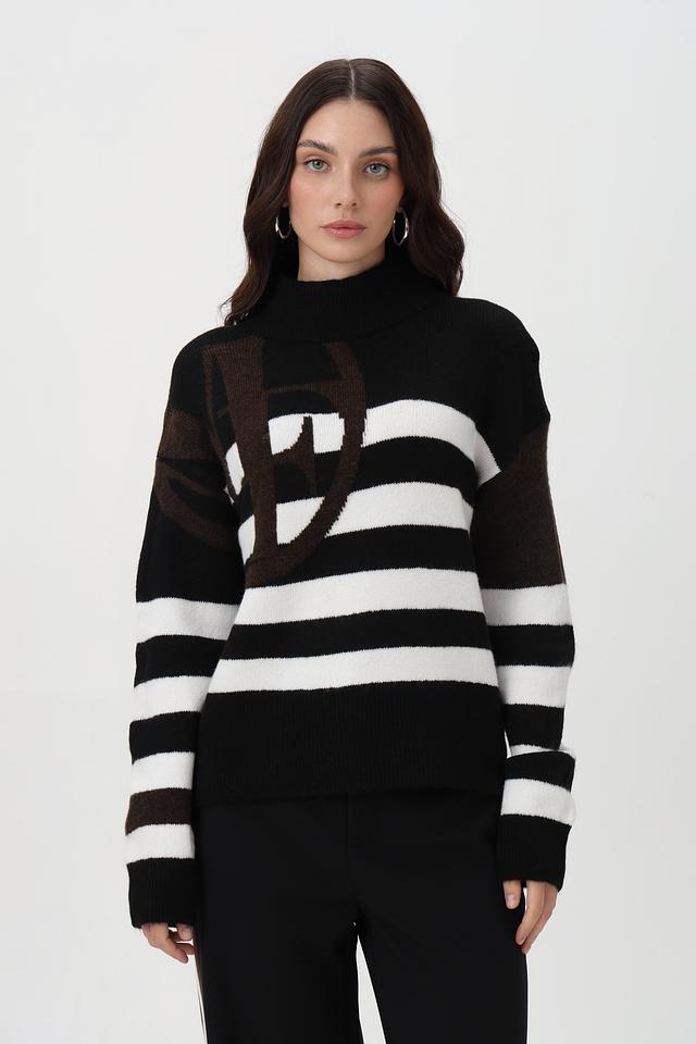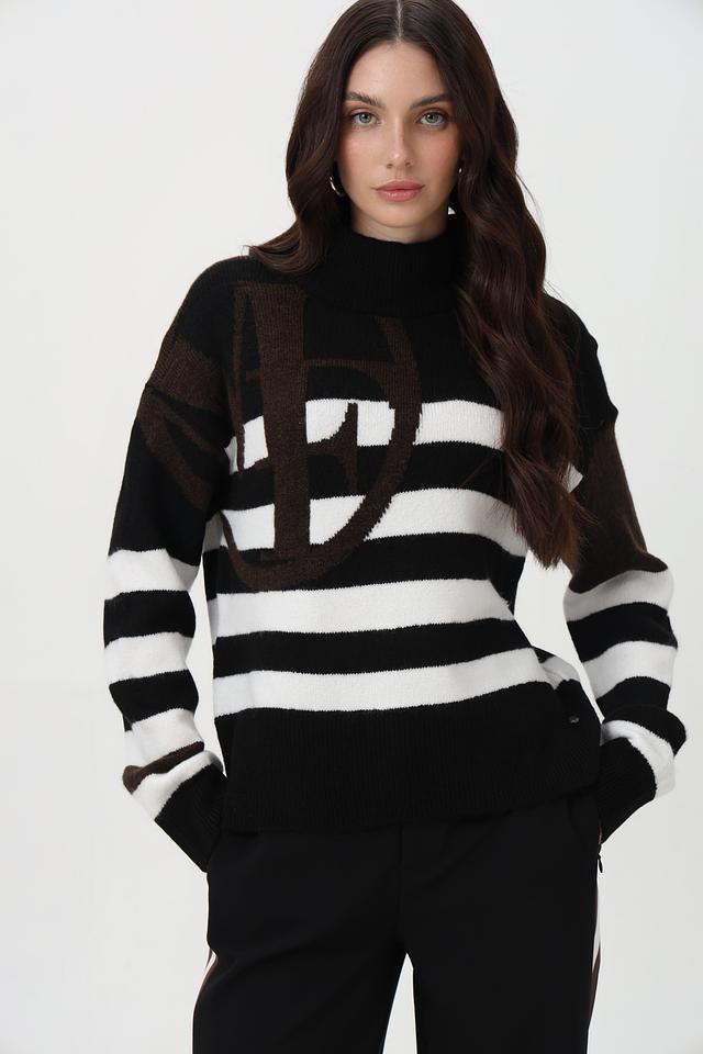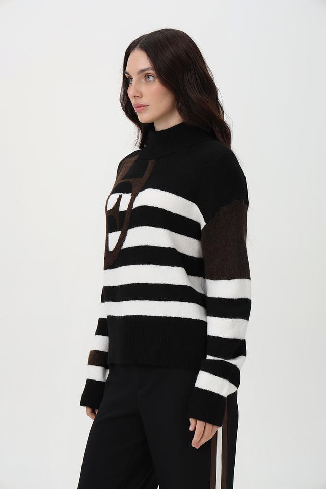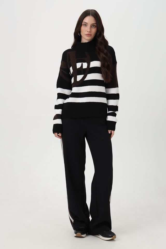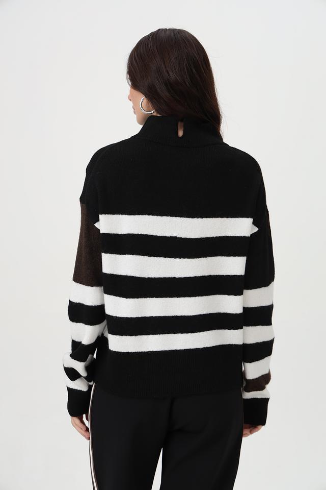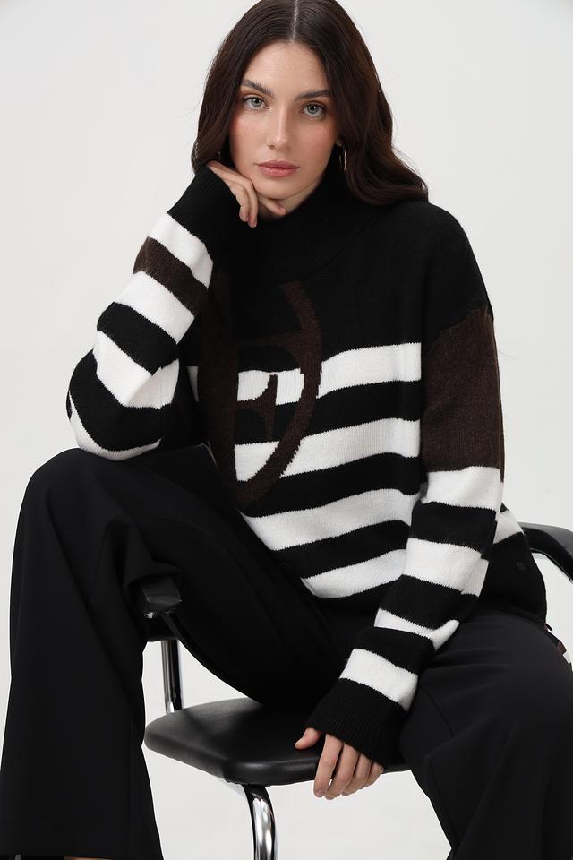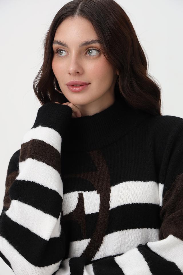 Пуловер выполнен в контрастном чёрно-бело-коричневом полосатом дизайне, что придает ему оригинальность и современный вид. Узор расположен горизонтально на основной части изделия и на рукавах.