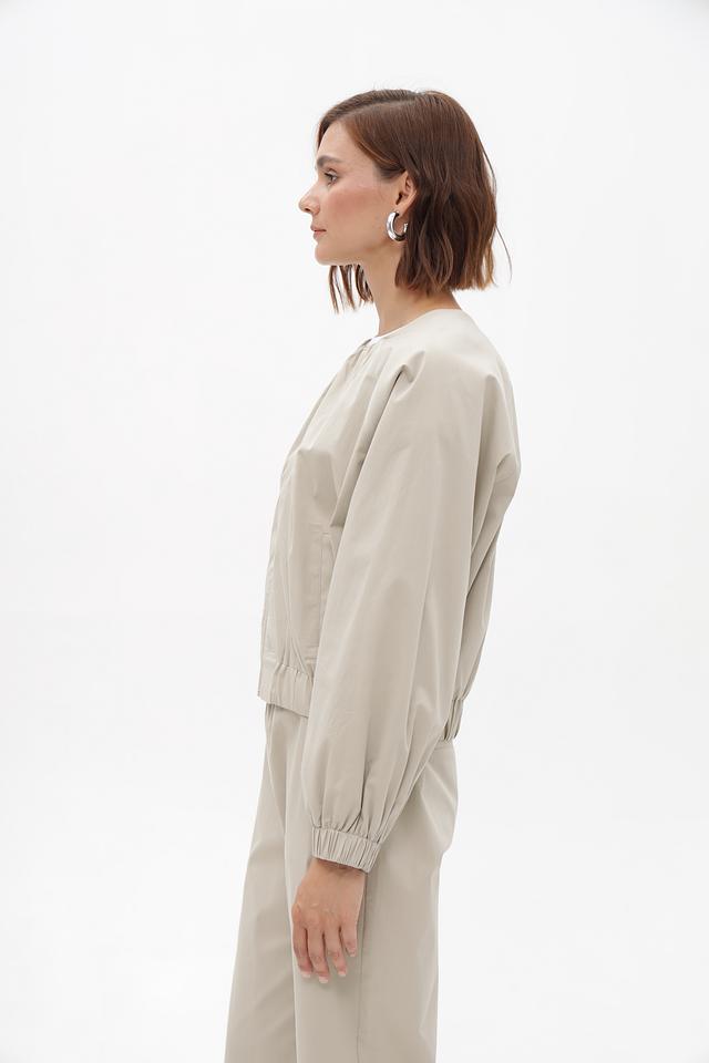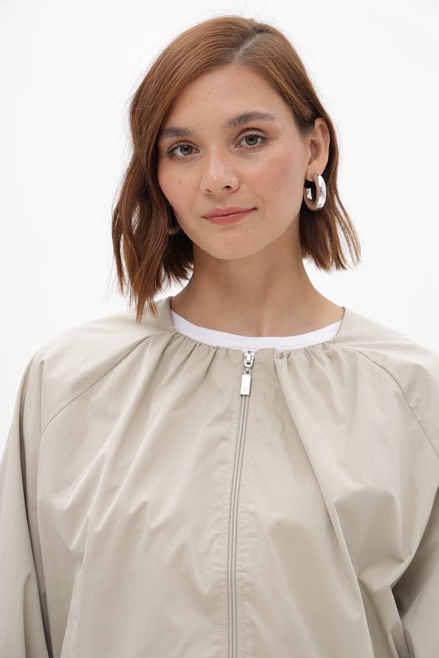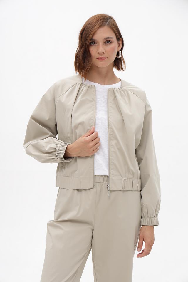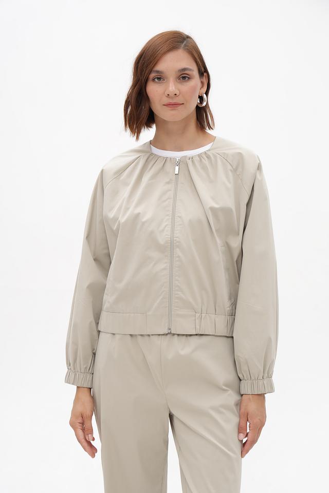 Женский жакет от бренда Monari выполнен в бежевом цвете. Модель имеет свободный крой и длину до талии. Застежка — молния по центру. Воротник — стойка.