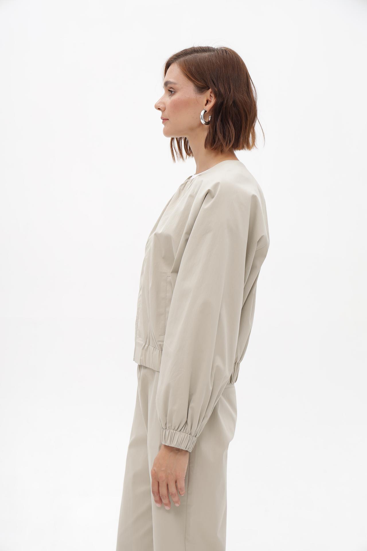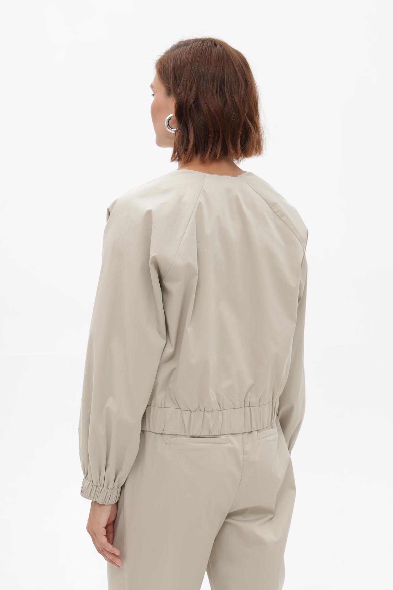 - Крой: Свободный крой с актуальным укороченным силуэтом и рукавами-реглан, собранными на резинку по манжетам, создает современный и женственный образ. Аккуратная линия плеч и минималистичный дизайн без воротника добавляют элегантности.