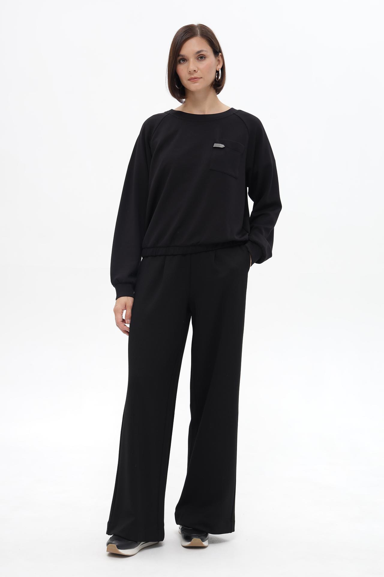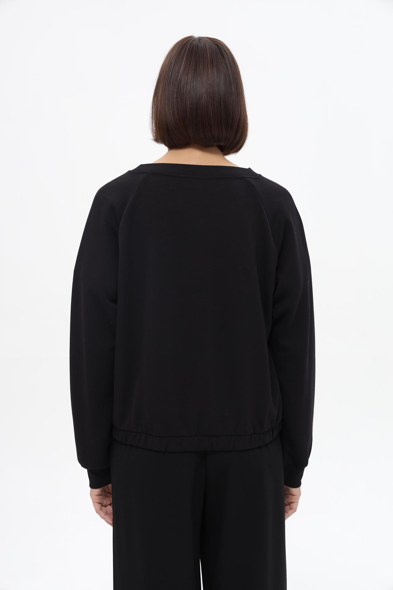 - Дизайн и крой: Модель имеет свободный силуэт с рукавами реглан, который обеспечивает свободу движений и комфорт. Эластичная манжета по низу изделия создает легкий сборка и подчеркивает талию.