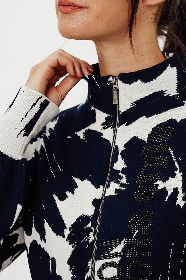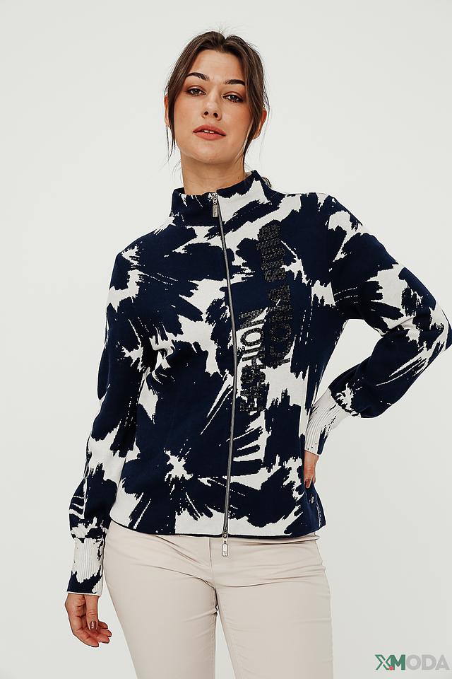 Женский жакет Monari темно-синего цвета с оригинальным абстрактным принтом. Модель на молнии с воротником-стойкой и манжетами в рубчик. Изготовлен из мягкого хлопкового трикотажа. Состав: хлопок 98%, полиамид 2%