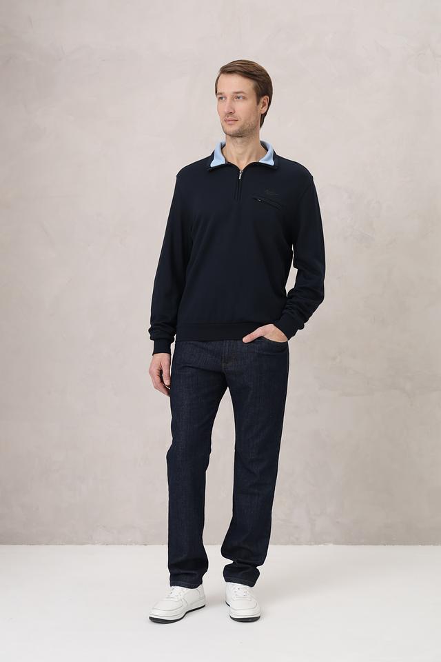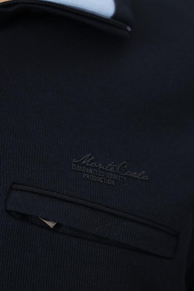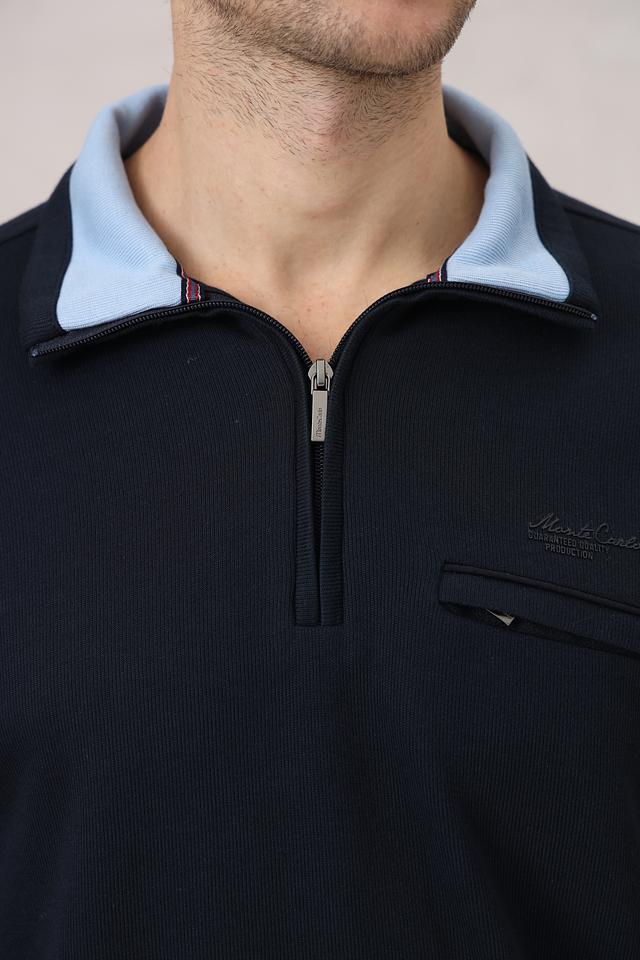 Мужской джемпер Monte Carlo темно-синего цвета с короткой молнией и воротником-стойкой. Изготовлен из мягкого и приятного к телу сочетания хлопка и модала, обеспечивающего комфорт в носке. Состав: хлопок 50%, модал 50%