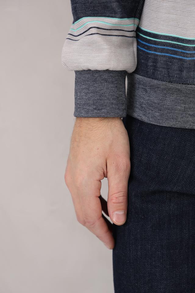 Представляем вашему вниманию стильный мужской джемпер от бренда Monte Carlo. Эта модель выполнена в серо-синей цветовой гамме с выразительным полосатым узором, который придаёт ей современный и динамичный вид.