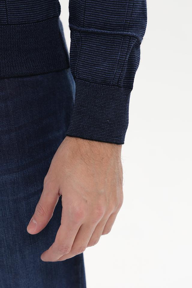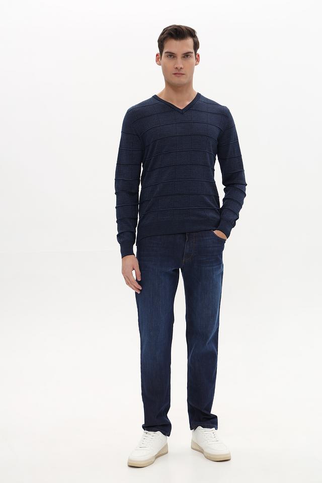 Мужской джемпер Monte Carlo синего цвета с геометрическим узором. Изготовлен из сочетания шерсти и полиакрила, обеспечивая комфорт и тепло. Модель имеет V-образный вырез. Состав: шерсть 50%, полиакрил 50%