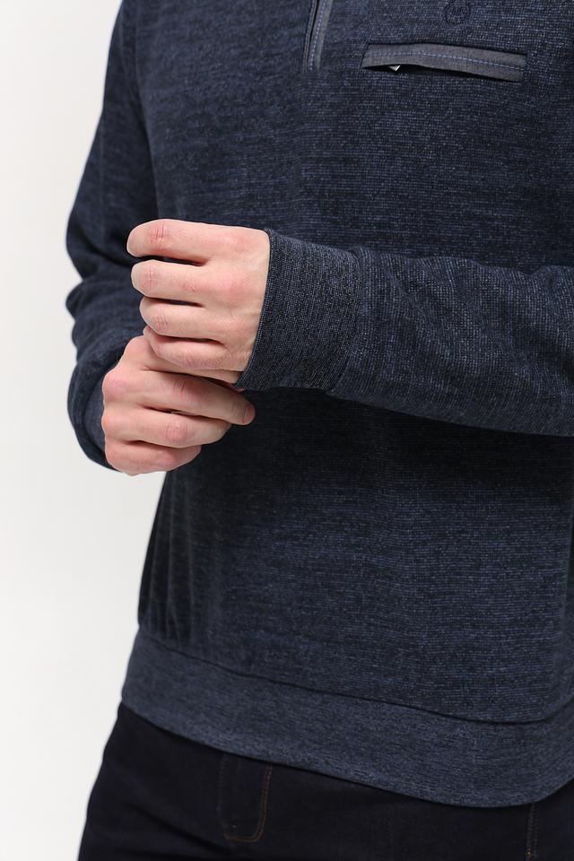 Поло имеет классический крой и тёмно-синий цвет с меланжированным эффектом. Короткая молния на горловине добавляет модели функциональности и позволяет регулировать степень открытости. На груди расположен накладной карман, который не только служит декоративным элементом, но и предоставляет дополнительное место для хранения мелких предметов.