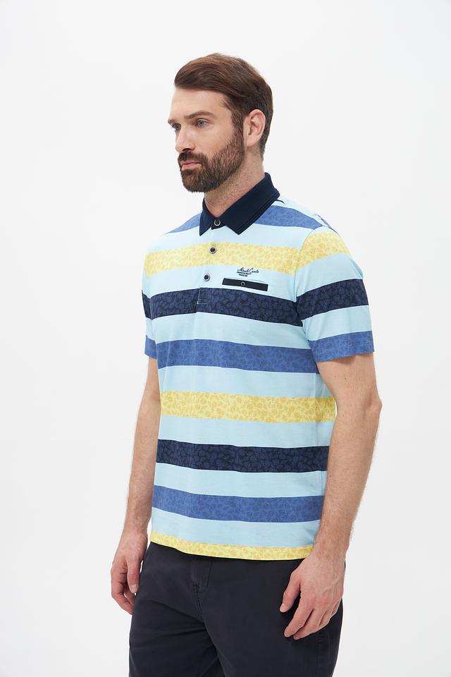 Поло выполнено в яркой цветовой гамме с оригинальным полосатым принтом, сочетающим в себе голубые, жёлтые и синие оттенки. Воротник и планка застёжки выполнены в тёмно-синем цвете, что добавляет контрастности и стиля.
