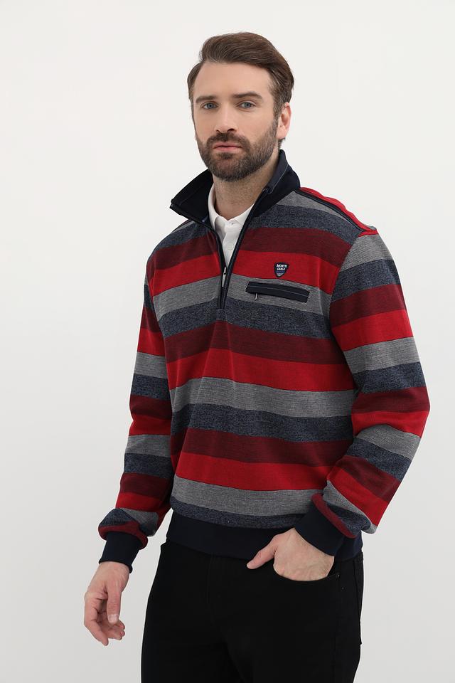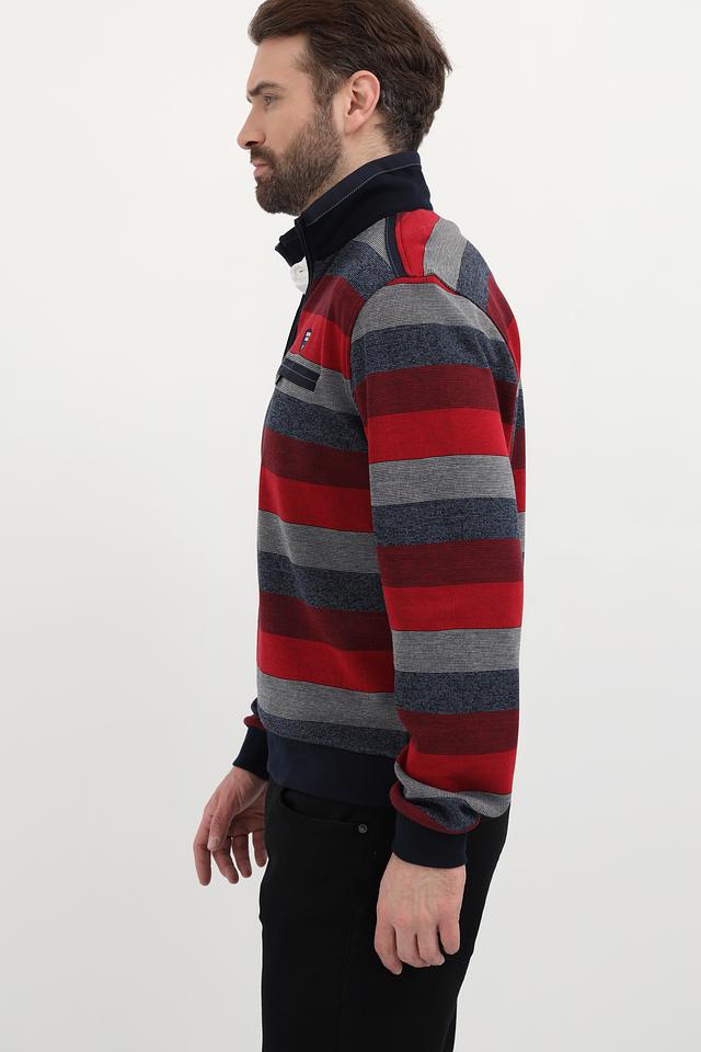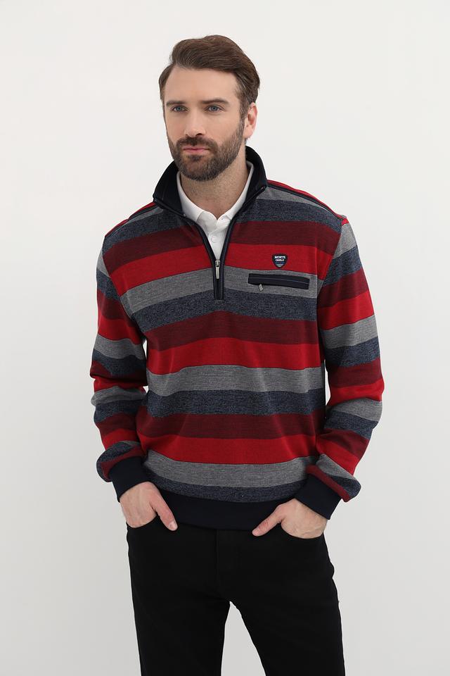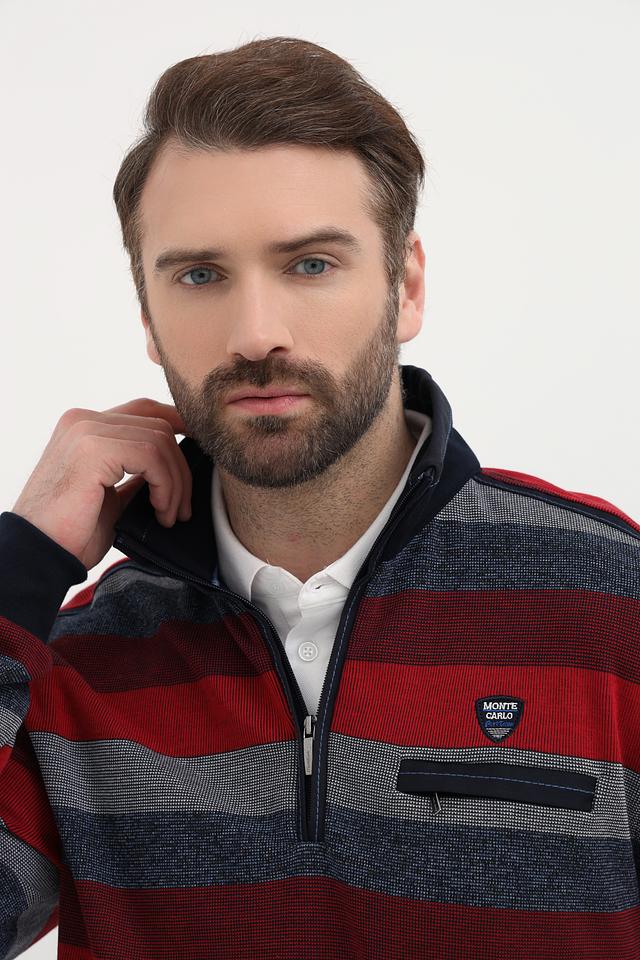 Мужской джемпер Monte Carlo красного цвета с полосатым узором и воротником-стойкой. Изготовлен из 100% хлопка, обеспечивающего комфорт и удобство в носке. Отличный выбор для создания стильного повседневного образа. Состав: хлопок 100%