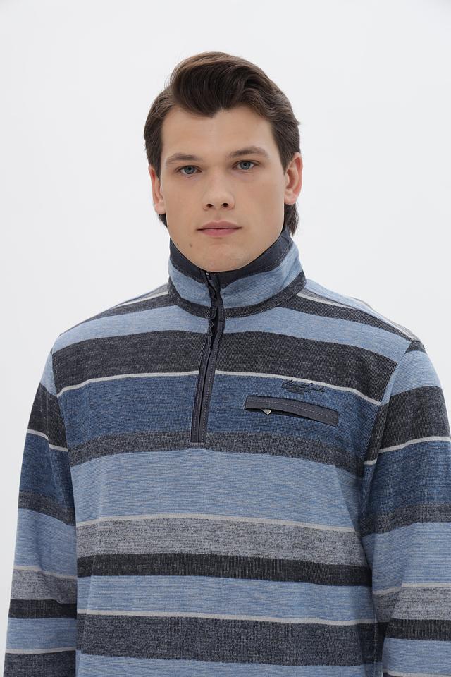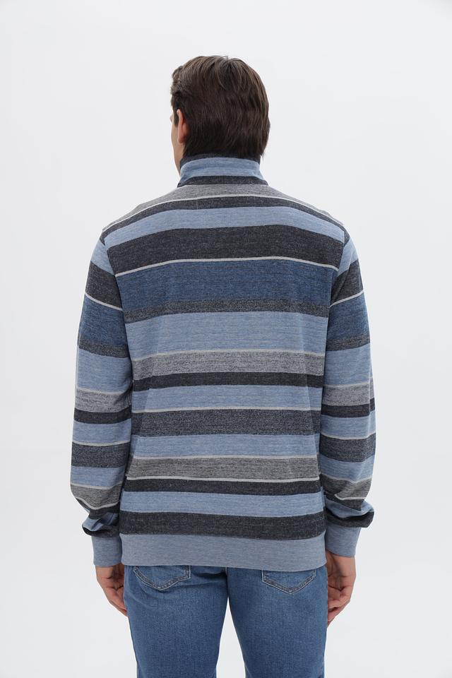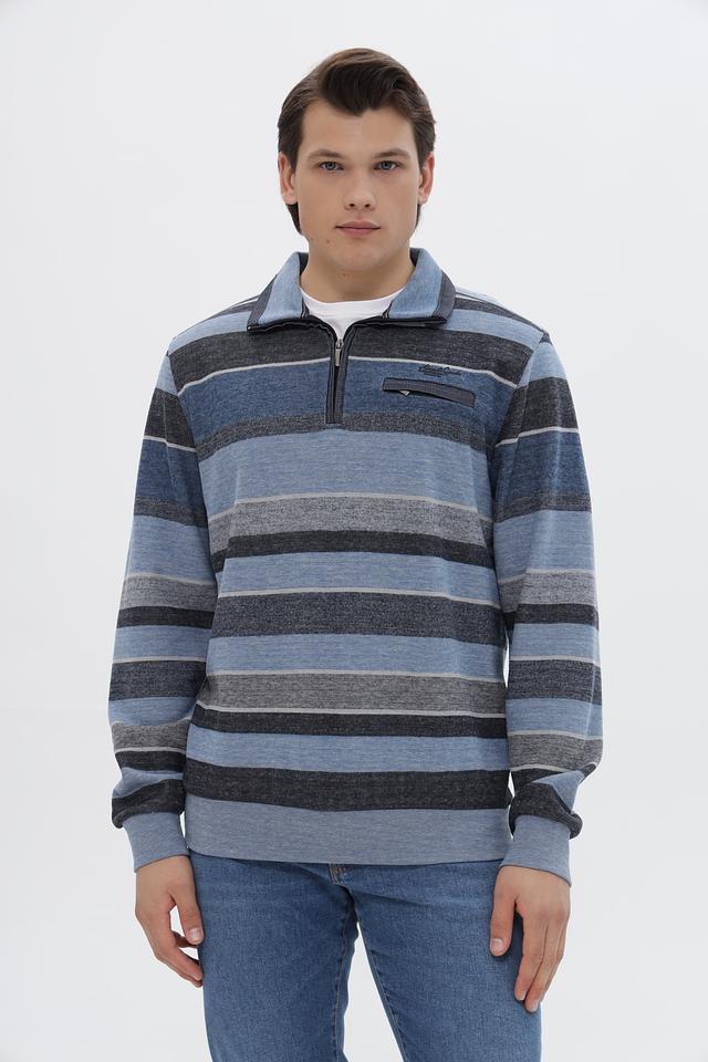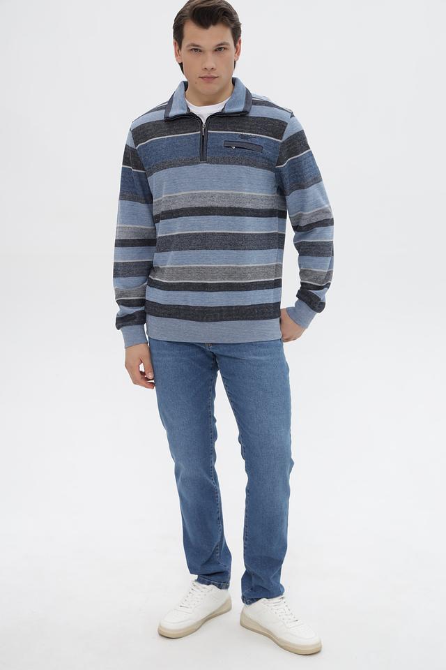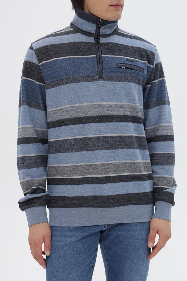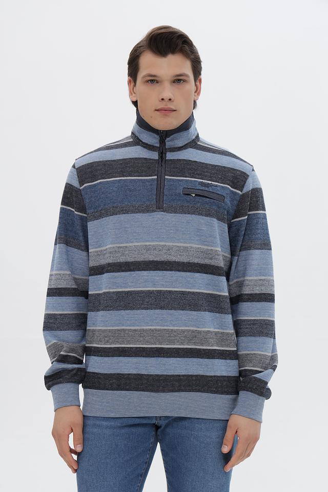 Мужской джемпер Monte Carlo голубого цвета с полосатым рисунком и застёжкой-молнией на горловине. Изготовлен из мягкого хлопка с добавлением полиэстера для комфорта и долговечности. Состав: хлопок 80%, полиэстер 20%