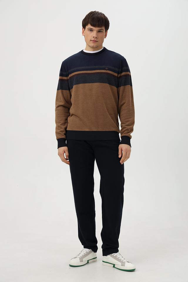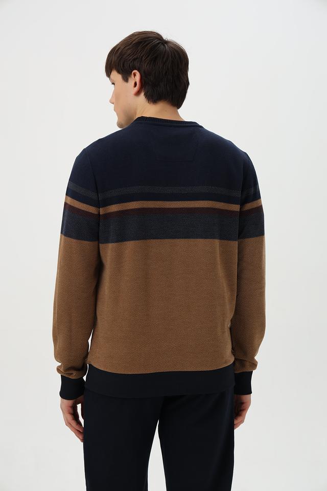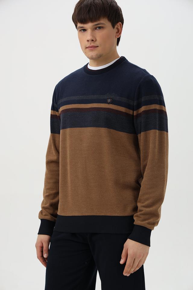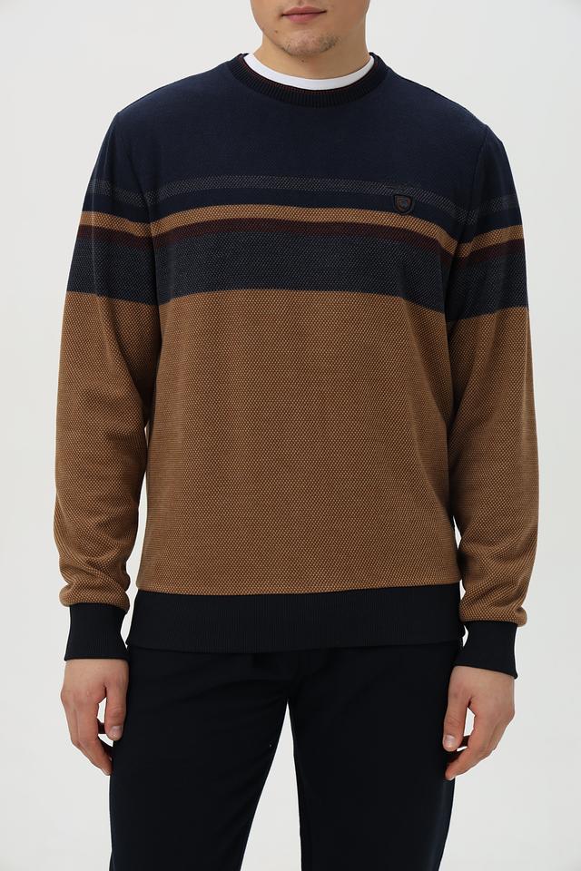 Мужской джемпер Monte Carlo коричневого и тёмно-синего цвета с полосатым узором. Изготовлен из хлопка с добавлением полиэстера для комфорта и долговечности. Состав: хлопок 65%, полиэстер 35%