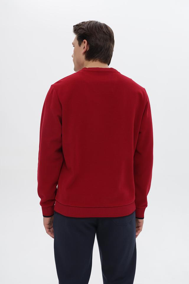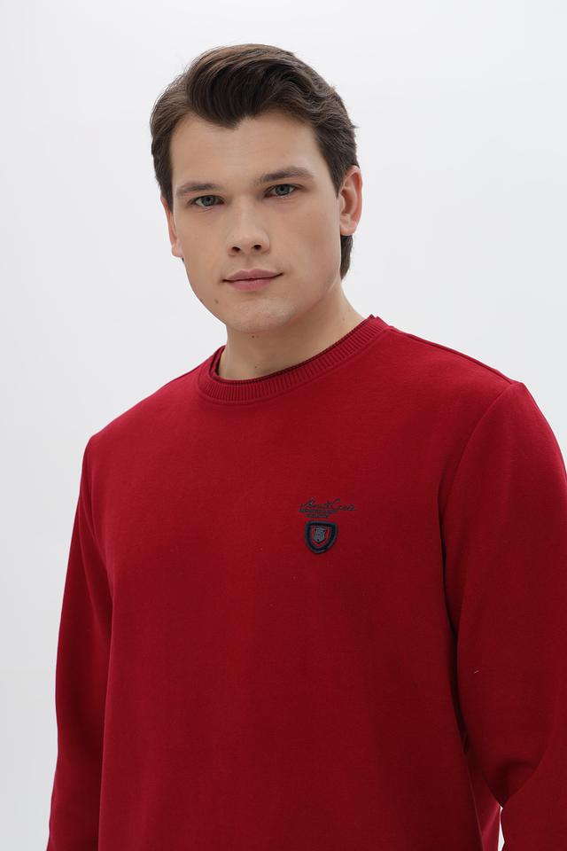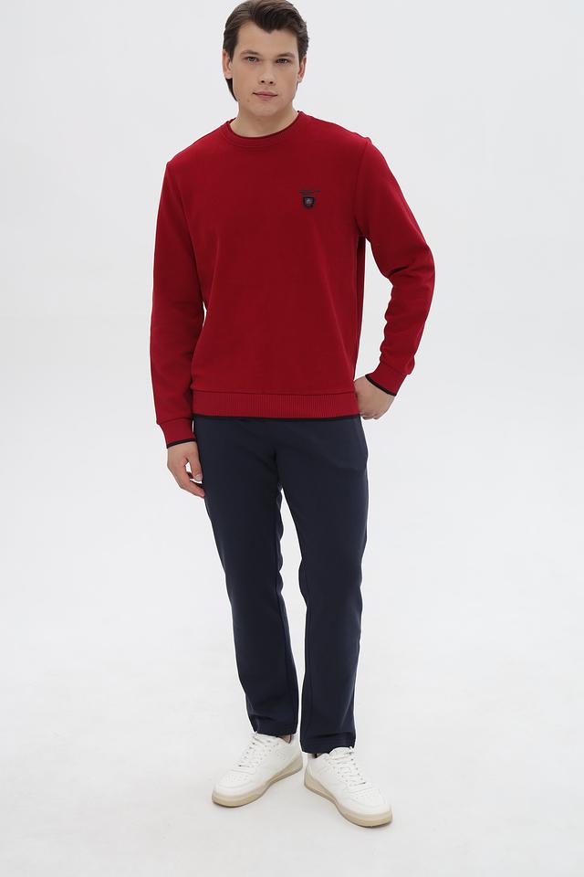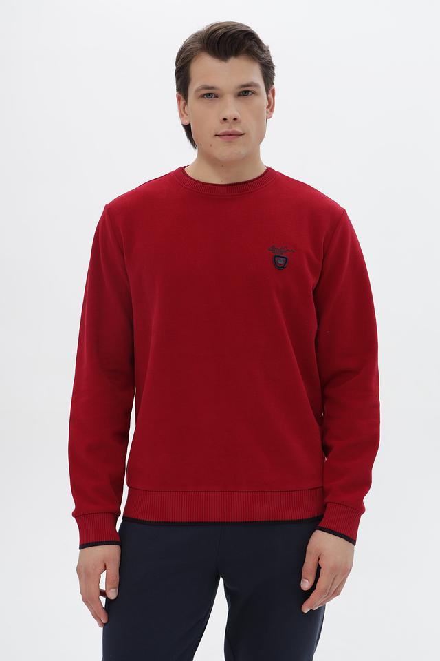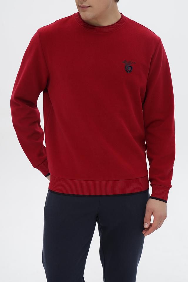 Джемпер имеет классический крой с круглым вырезом горловины и длинными рукавами. Основной цвет – насыщенный красный, который отлично подойдет для создания ярких образов. На груди расположен небольшой вышитый логотип бренда в контрастных цветах.