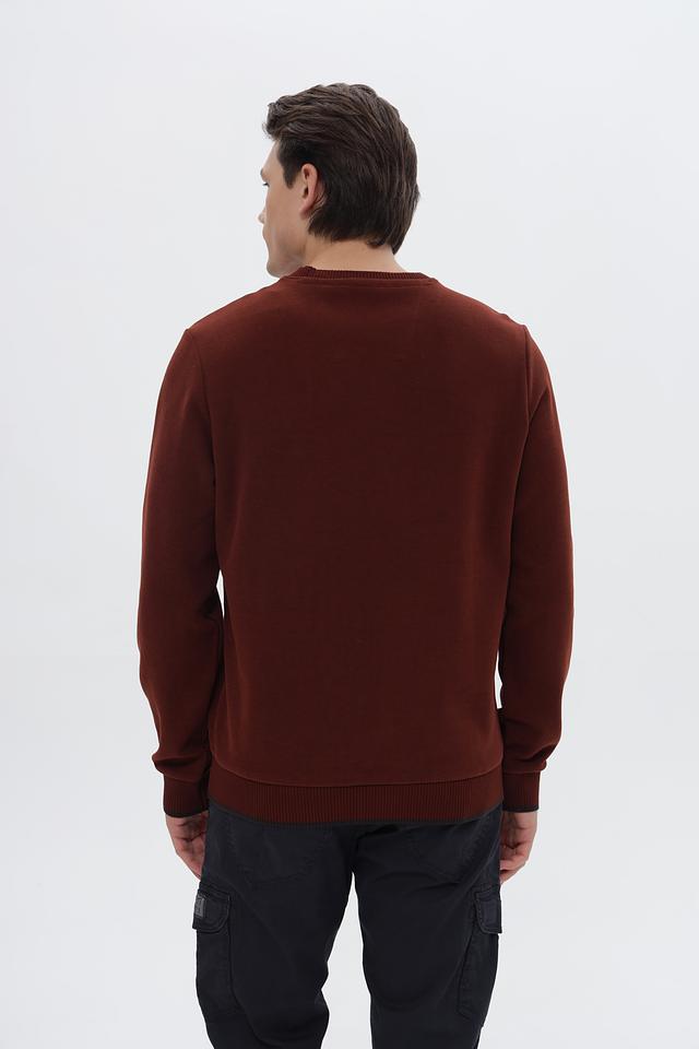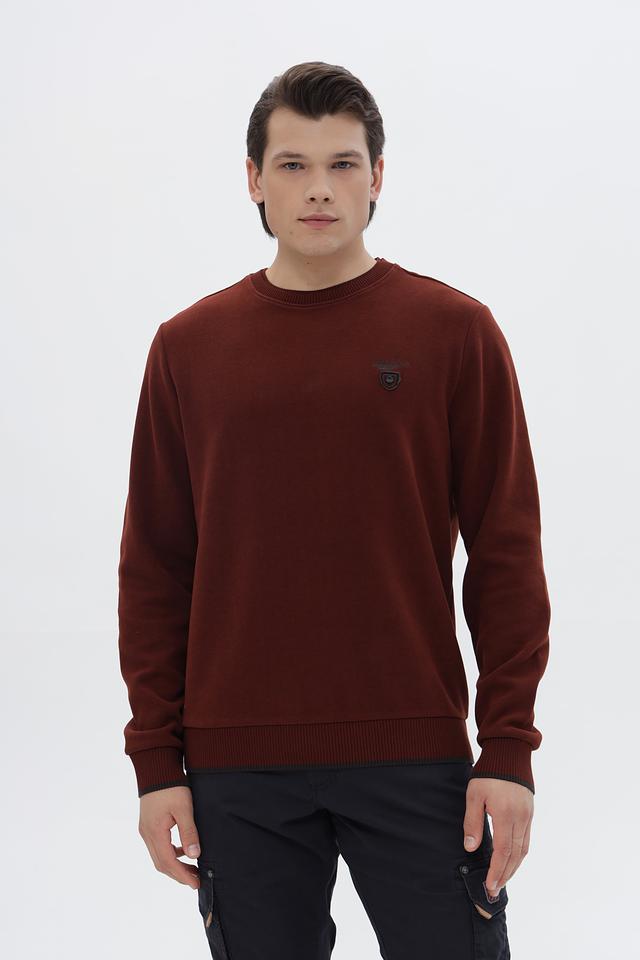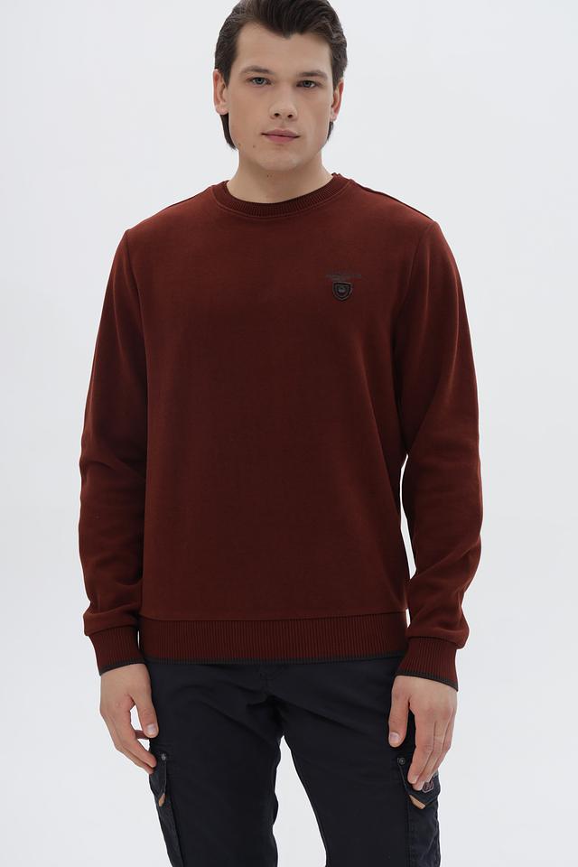 Джемпер имеет классический крой с круглым вырезом горловины и длинными рукавами. Манжеты и нижний край выполнены из плотной резинки, обеспечивающей комфортную посадку по фигуре. На груди расположен небольшой логотип бренда, выполненный в тон.