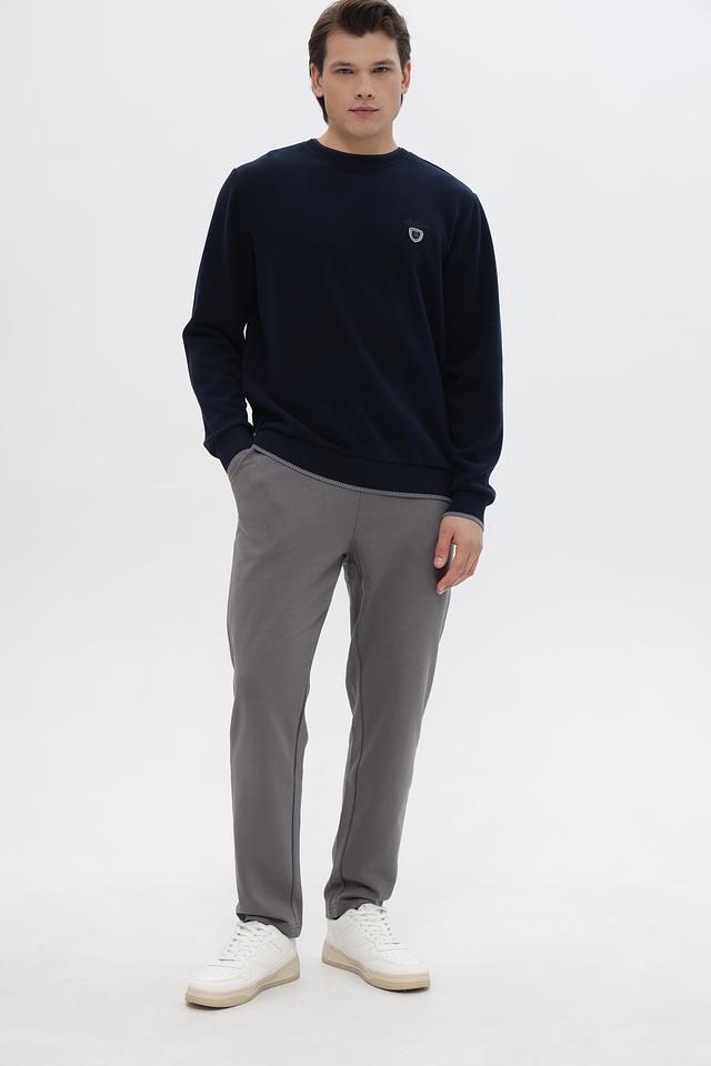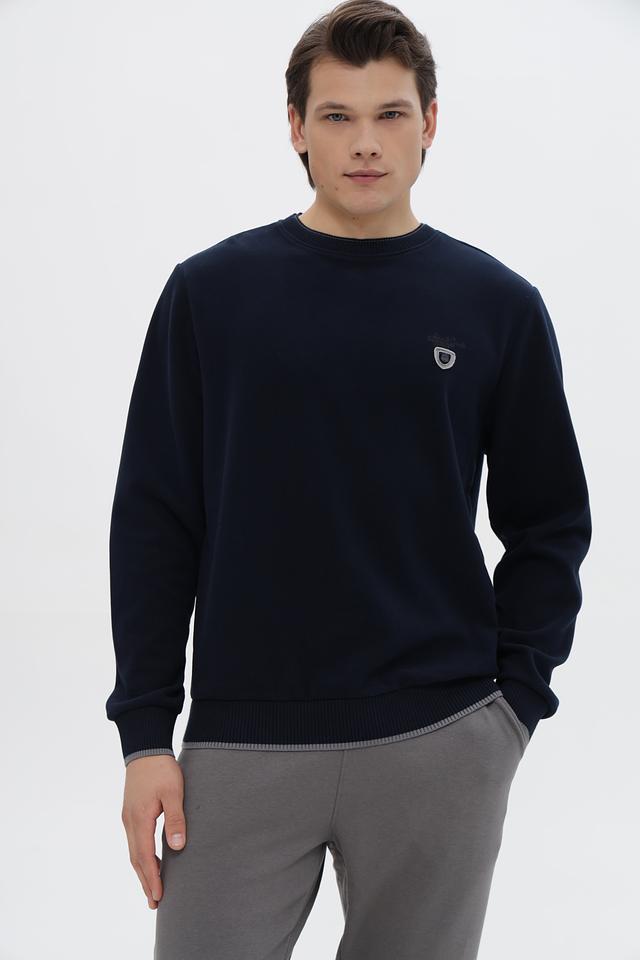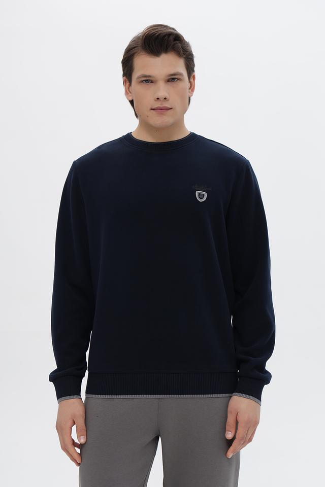 Свитер имеет круглый вырез горловины и длинные рукава. На груди слева расположена небольшая эмблема бренда, выполненная в сером цвете. Манжеты и нижний край джемпера имеют резинку с контрастной серой полосой, что добавляет модели стильный акцент.