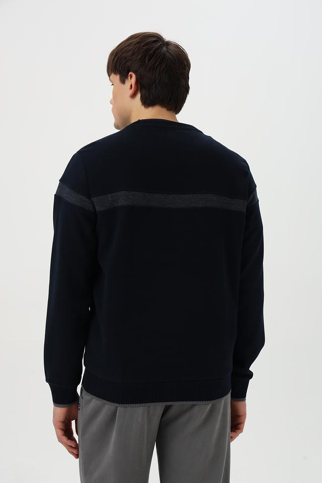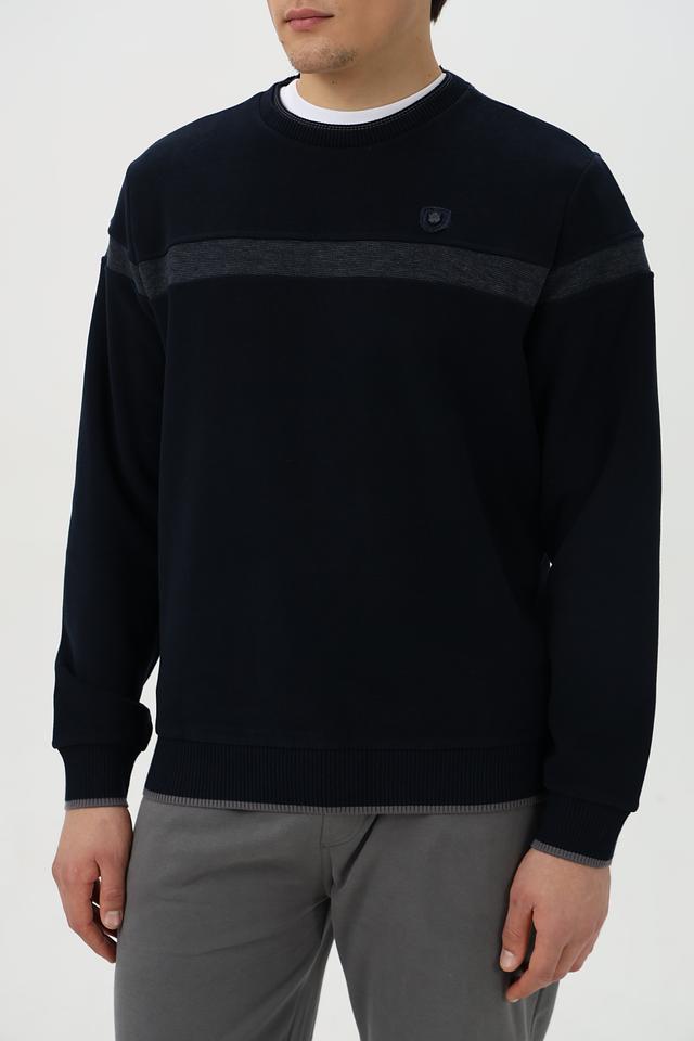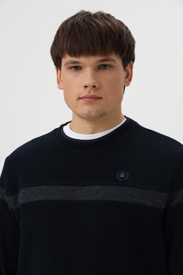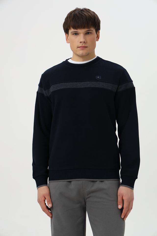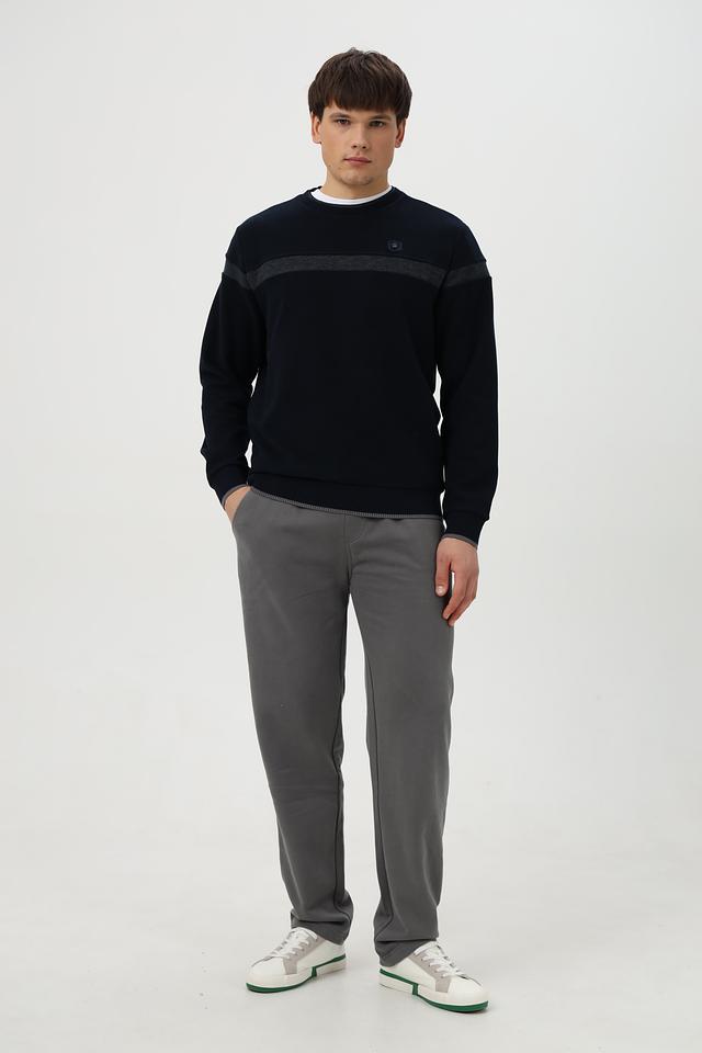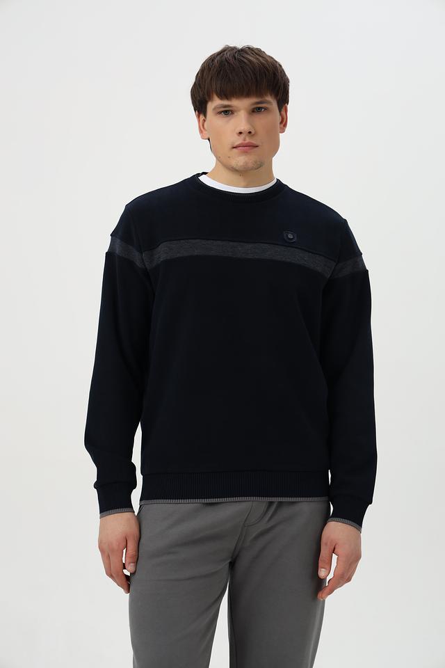 Дизайн джемпера дополнен горизонтальной полосой на груди и манжетах, выполненной в сером цвете. Это придает модели стильный и современный вид. Тёмно-синий цвет делает джемпер универсальным и легко сочетаемым с другими элементами гардероба.