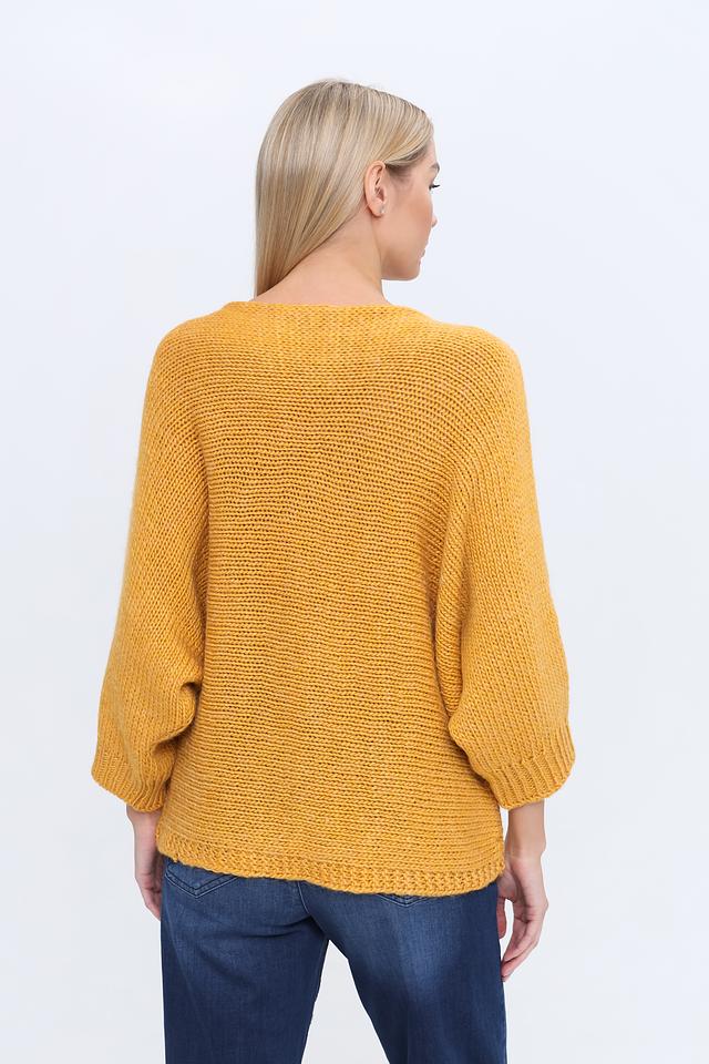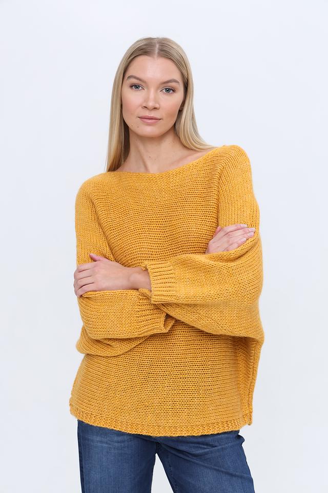 Пуловер имеет свободный крой, который не сковывает движения и позволяет создать расслабленный образ. Рукава-фонарики добавляют изделию женственности и оригинальности. Горчичный цвет пуловера универсален и легко сочетается с другими цветами и стилями одежды.
