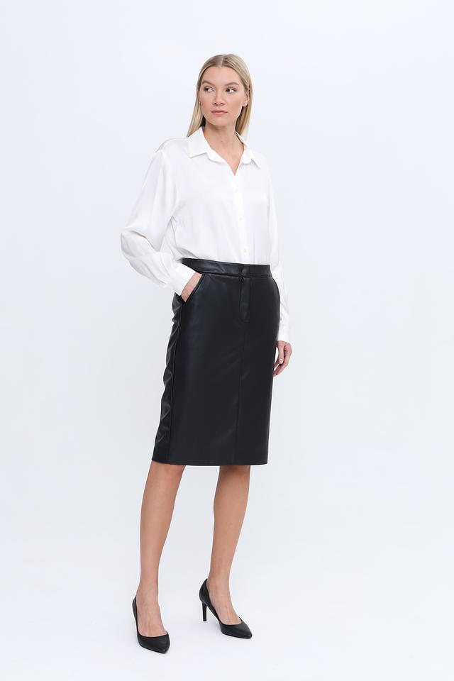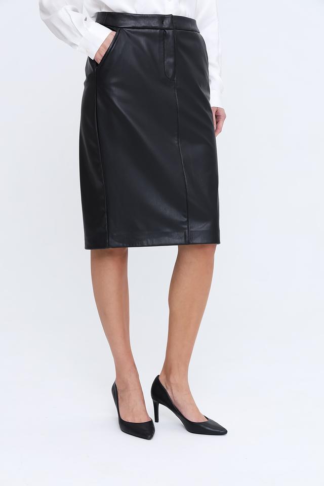 Чёрная юбка-карандаш от MORE and MORE выполнена из гладкой экокожи. Классический крой и лаконичный дизайн делают эту юбку универсальным элементом гардероба. Состав: полиэстер 65%, полиуретан 35%