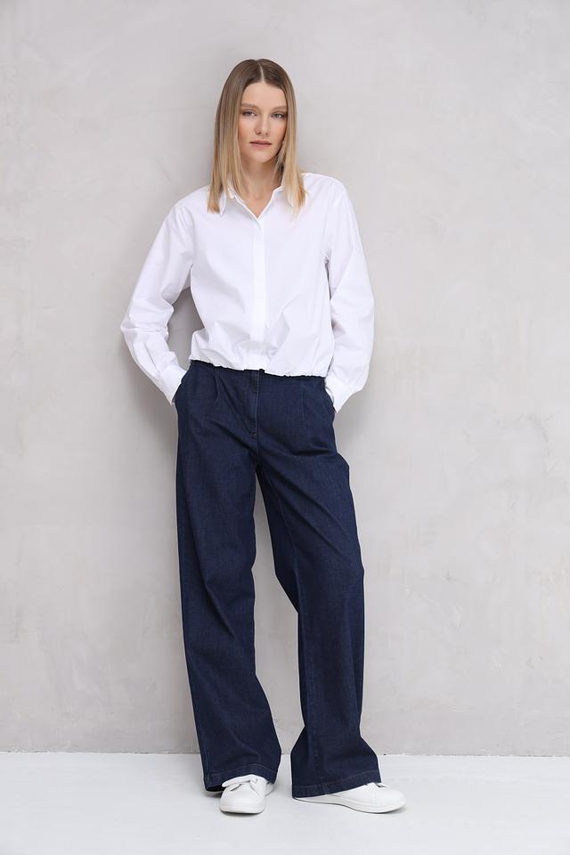 Блуза имеет приталенный силуэт, который подчеркивает фигуру, и длинные рукава с аккуратными манжетами. Отложной воротник добавляет образу строгости и деловитости. Застежка на пуговицах по всей длине переда.