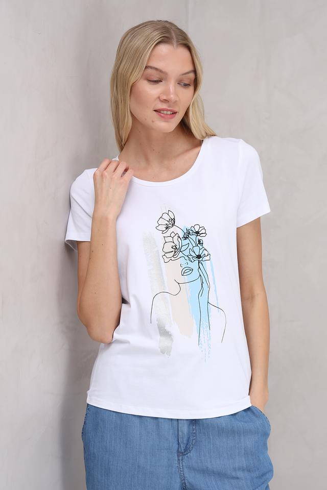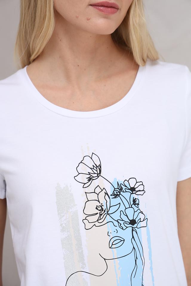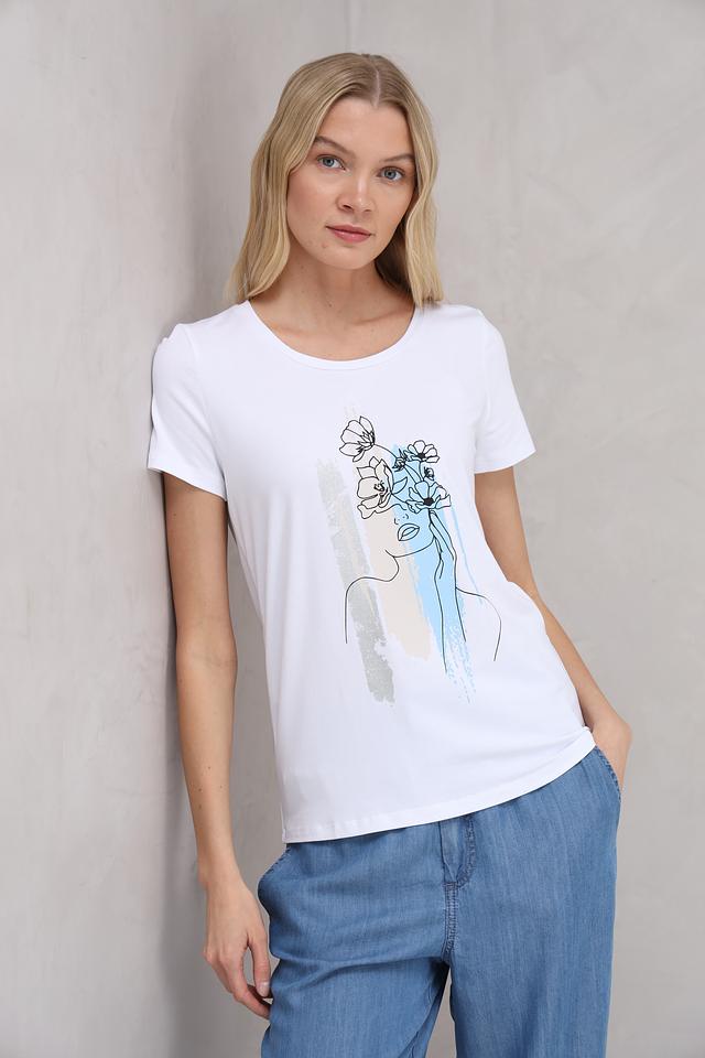 Белая футболка от MORE and MORE с оригинальным принтом в виде абстрактного изображения лица и цветов. Изготовлена из мягкого и приятного к телу сочетания хлопка, модала и эластана, обеспечивающего комфорт при носке. Состав: хлопок 48%, модал 48%, эластан 4%