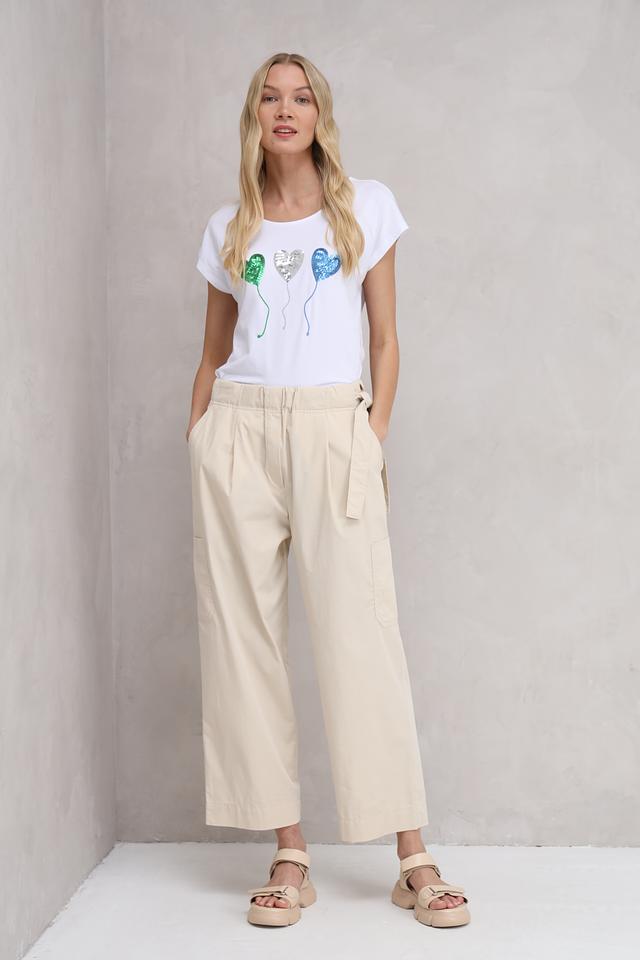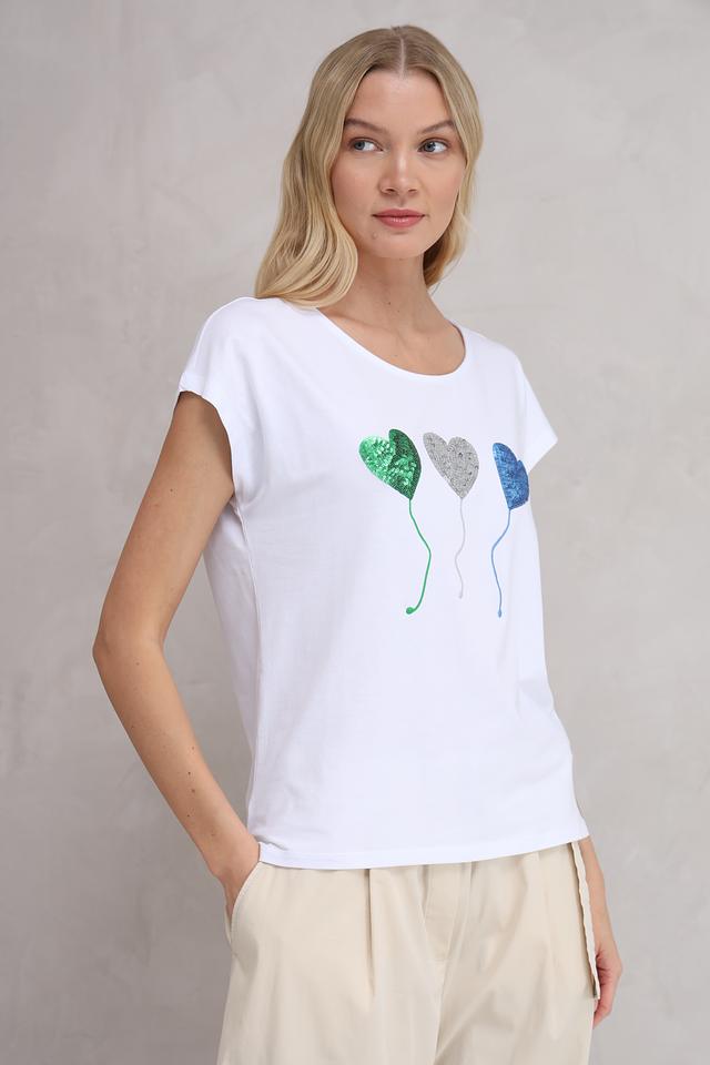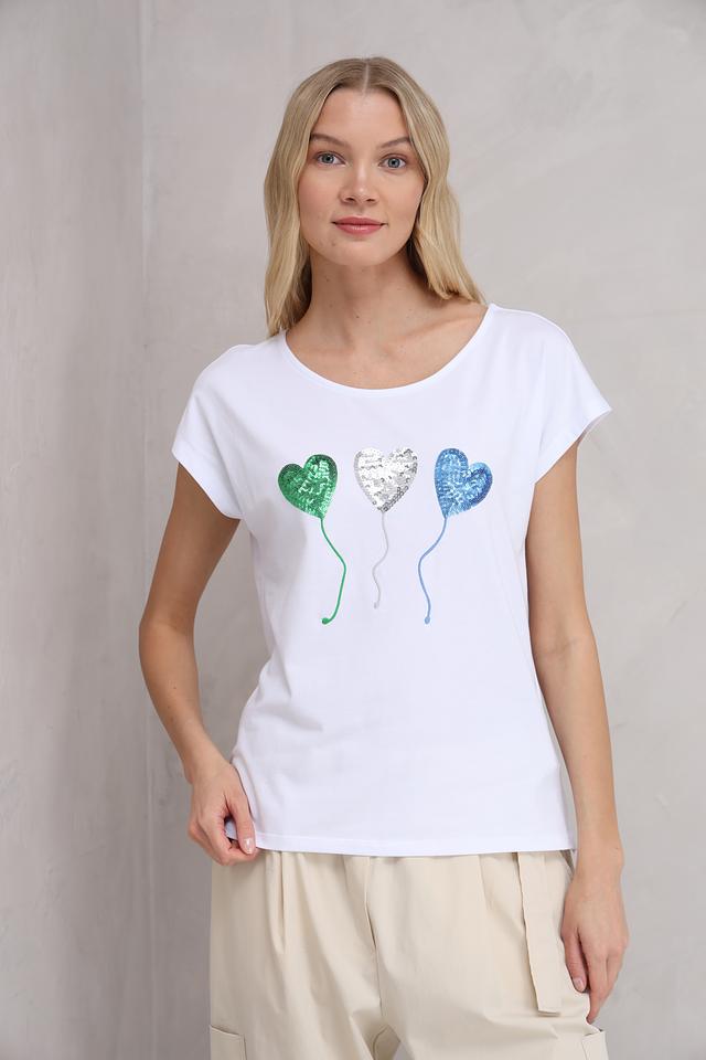 Эта стильная футболка от бренда More and More станет отличным дополнением к вашему гардеробу. Футболка выполнена в белом цвете и украшена оригинальным принтом с изображением воздушных шаров в форме сердца.