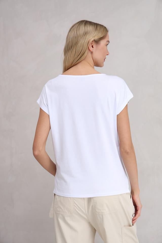 Состав ткани: 48% хлопок, 48% модал и 4% эластан. Хлопок обеспечивает воздухопроницаемость и мягкость, модал – приятные тактильные ощущения, а эластан – эластичность и сохранение формы. Эта футболка идеально подойдет для создания повседневных образов.
