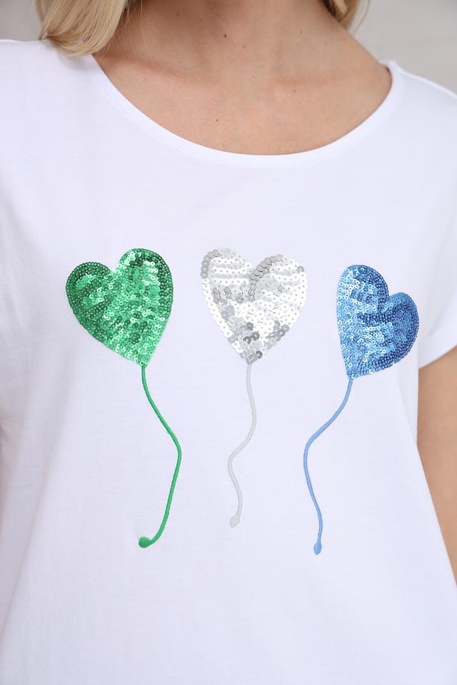 Белая футболка More and More с ярким принтом в виде воздушных шаров в форме сердца. Изготовлена из мягкого и приятного к телу сочетания хлопка, модала и эластана, обеспечивающего комфорт при носке. Состав: хлопок 48%, модал 48%, эластан 4%