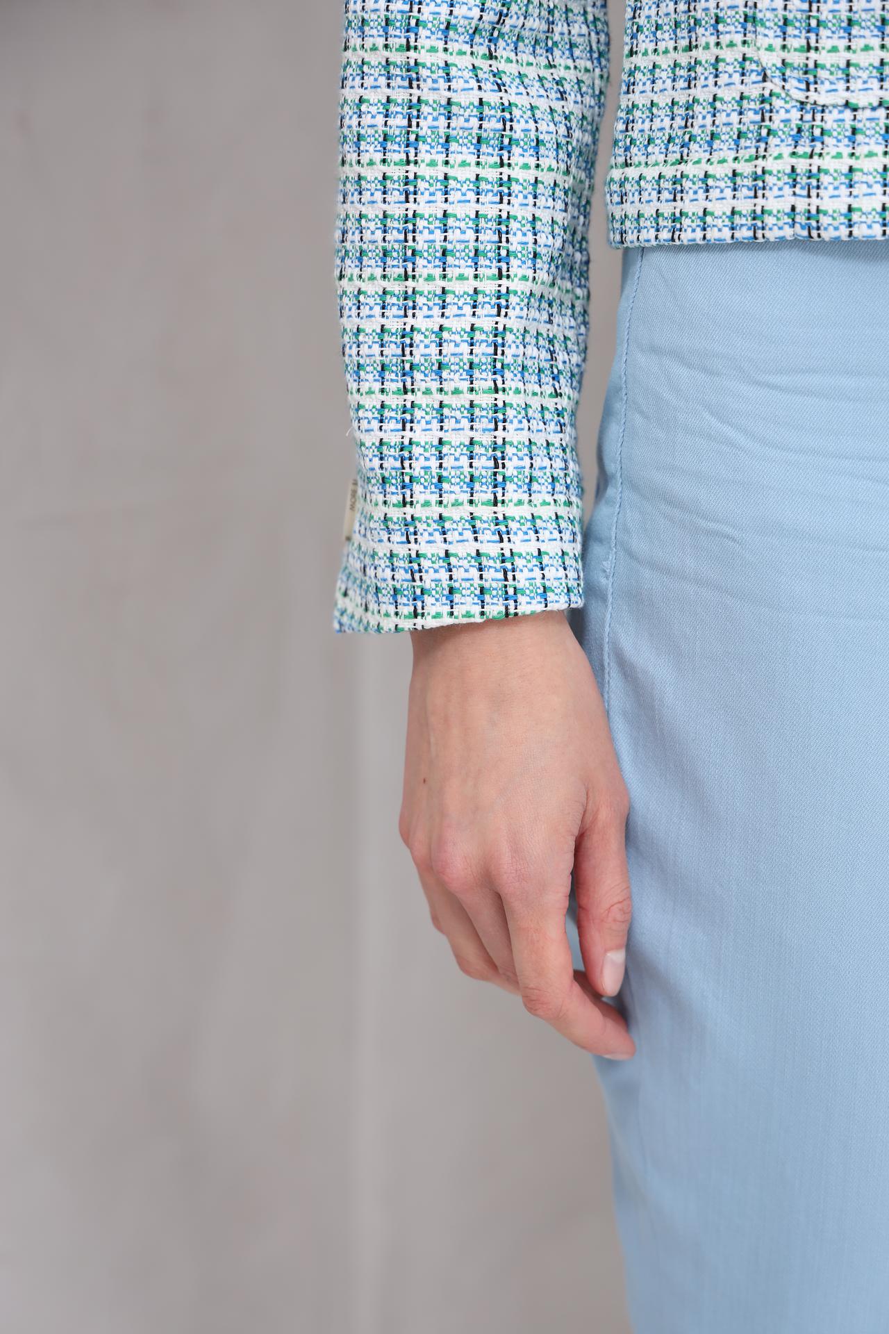 - Фактурная ткань: Твидовая фактура в сочетании светлых оттенков голубого, синего, зеленого и белого придает жакету особый шарм и изысканность. Этот уникальный узор делает женский жакет заметным акцентом в любом ансамбле.