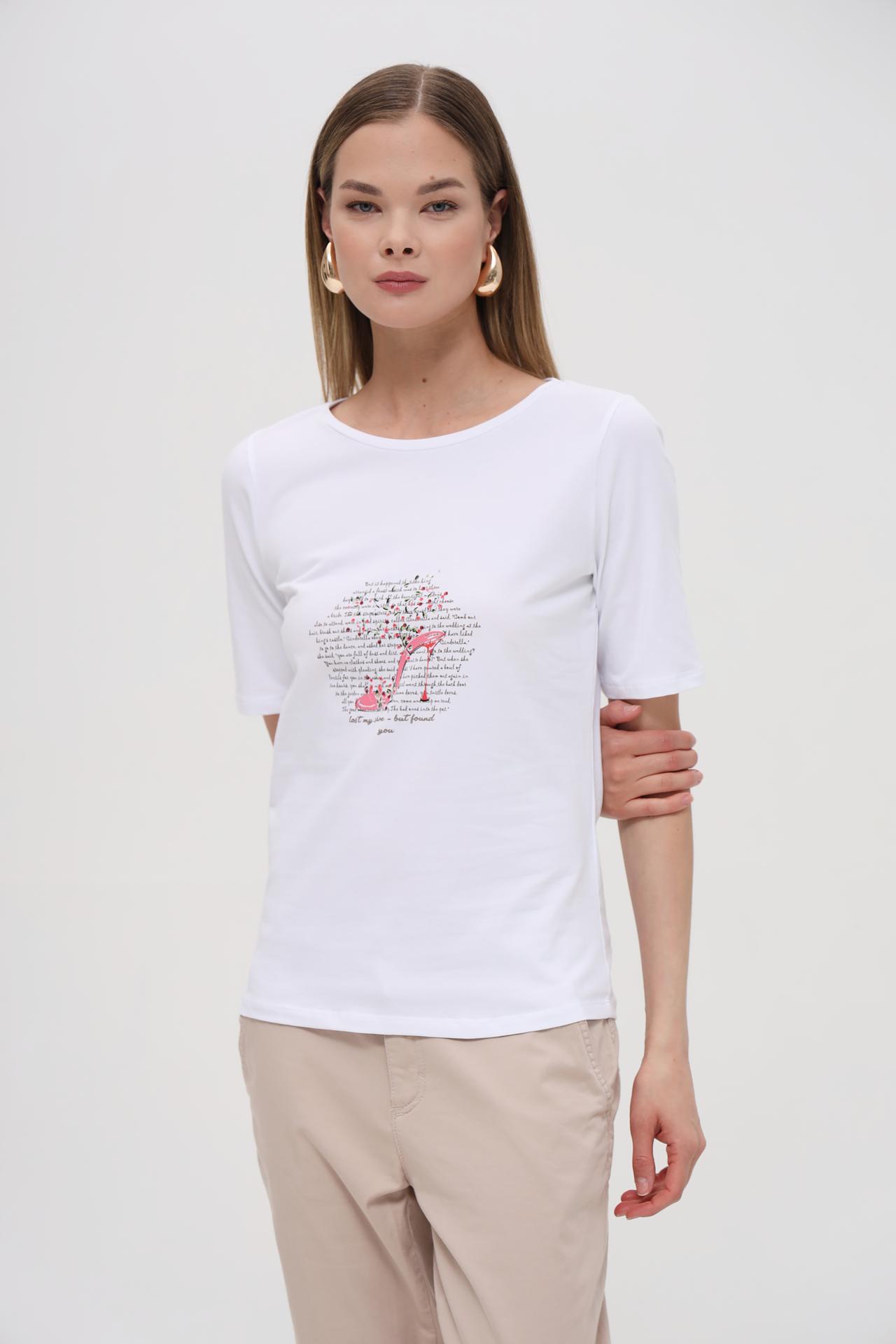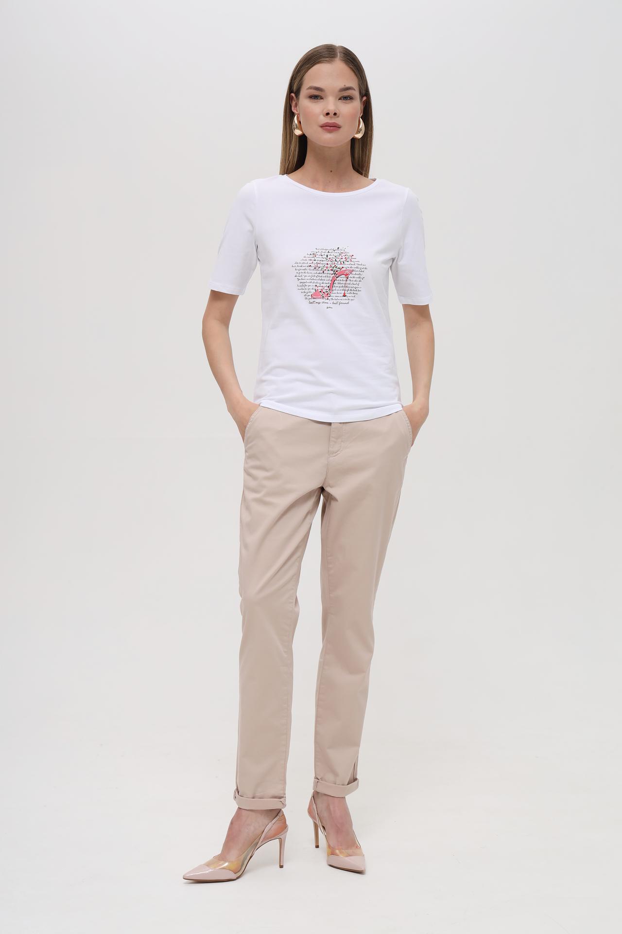 Женская футболка MORE and MORE белого цвета. Классическая модель с округлым вырезом горловины и коротким рукавом. Изделие из 94% хлопка и 6% эластана обеспечивает комфорт и идеальную посадку по фигуре, сохраняя форму после многочисленных стирок. Легкая и дышащая ткань идеально подходит для повседневной носки.