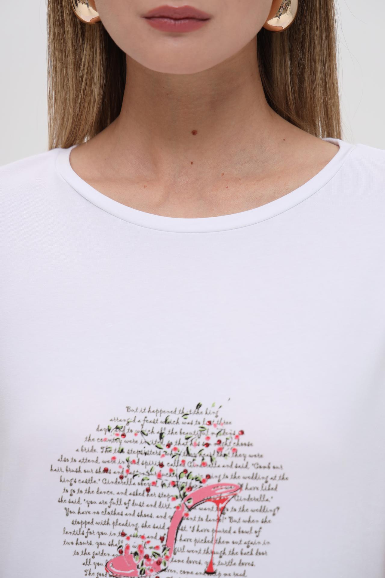 - Стильный принт. Изящное изображение туфельки в сочетании с текстом придает футболке женственный и утонченный вид. Этот акцент делает изделие уникальным и привлекательным.