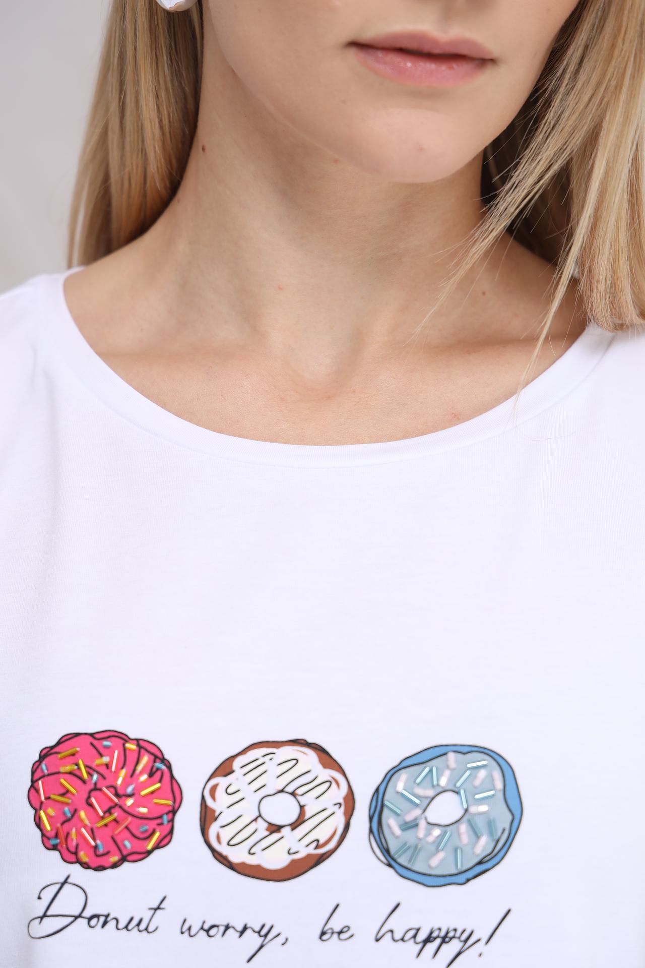- Стильный дизайн: Актуальный принт с надписью 'Donut worry, be happy!' добавляет образу игривости.