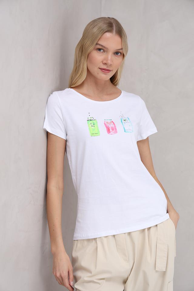 Белая футболка More and More с ярким принтом в виде банок лайма, грейпфрута и кокоса станет отличным дополнением к вашему летнему гардеробу. Изготовлена из 100% хлопка, обеспечивая комфорт и воздухопроницаемость. Состав: хлопок 100%