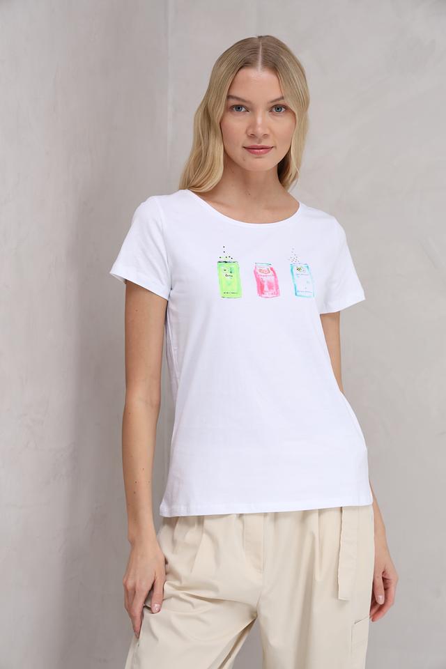 Основной цвет футболки – белый, который служит идеальным фоном для яркого и оригинального принта. На передней части футболки изображены четыре банки с напитками: лайм, грейпфрут, кокос и ещё одна банка с неясным напитком, выполненные в ярких цветах – лаймовом, розовом и голубом.