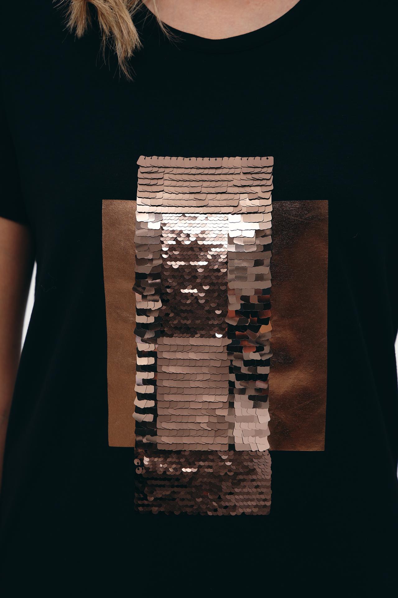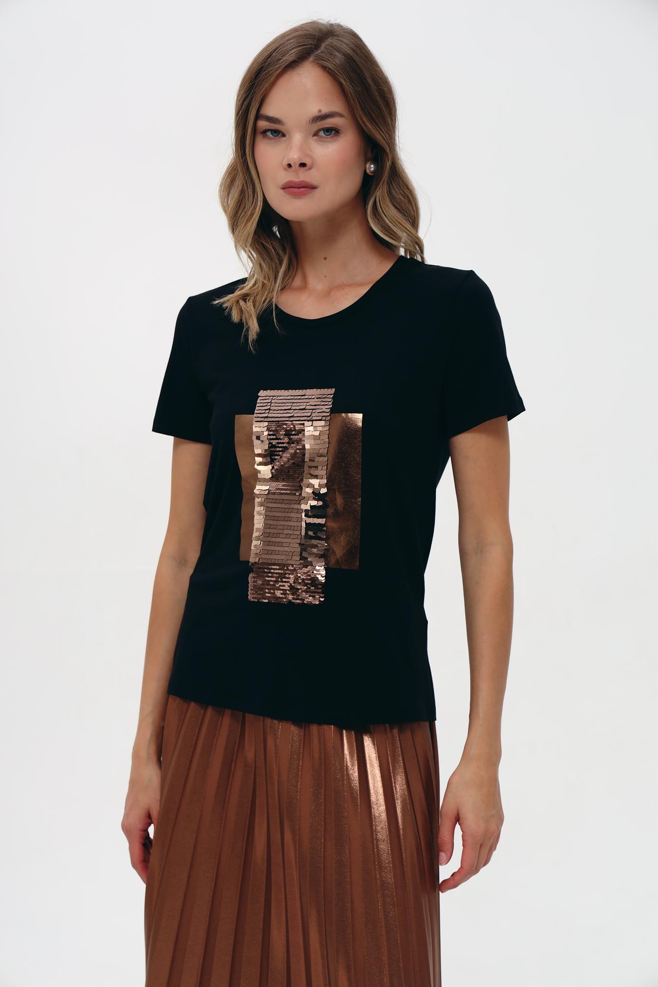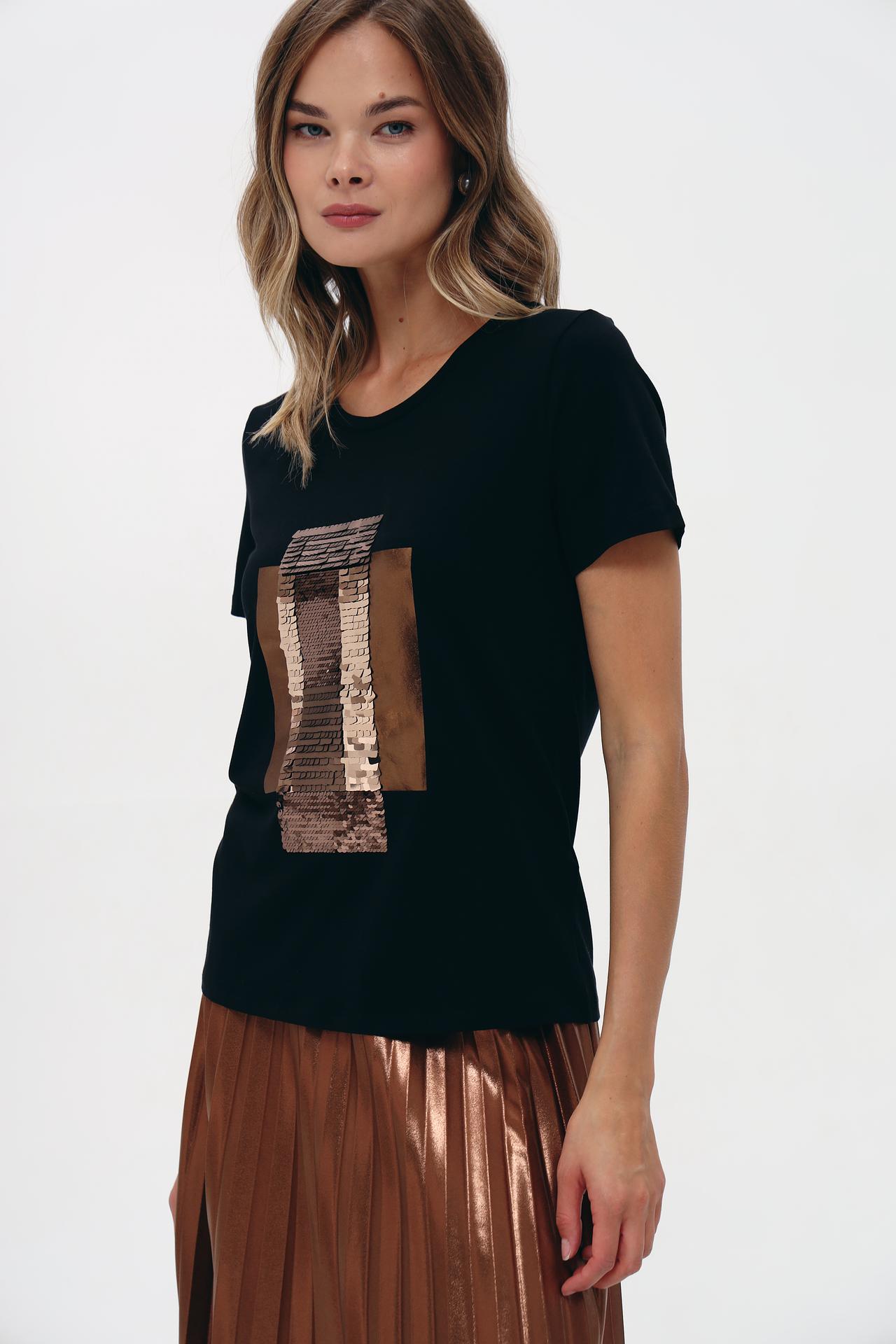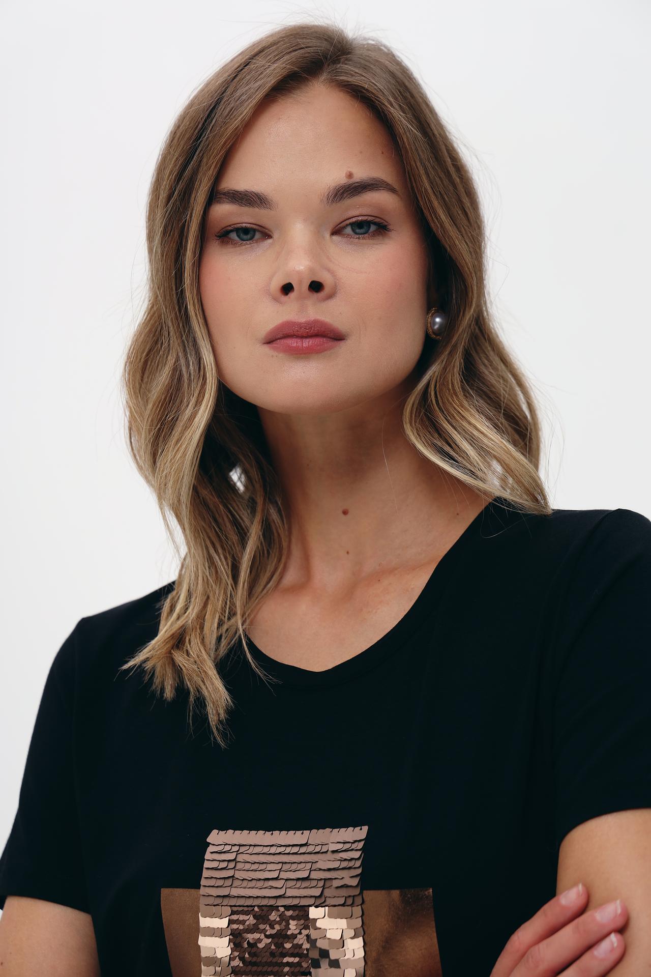 - Дизайн: Лаконичный черный цвет футболки выгодно контрастирует с эффектным принтом, выполненным в виде аппликации из переливающихся пайеток. Такой дизайн добавляет изюминку и делает модель актуальной.