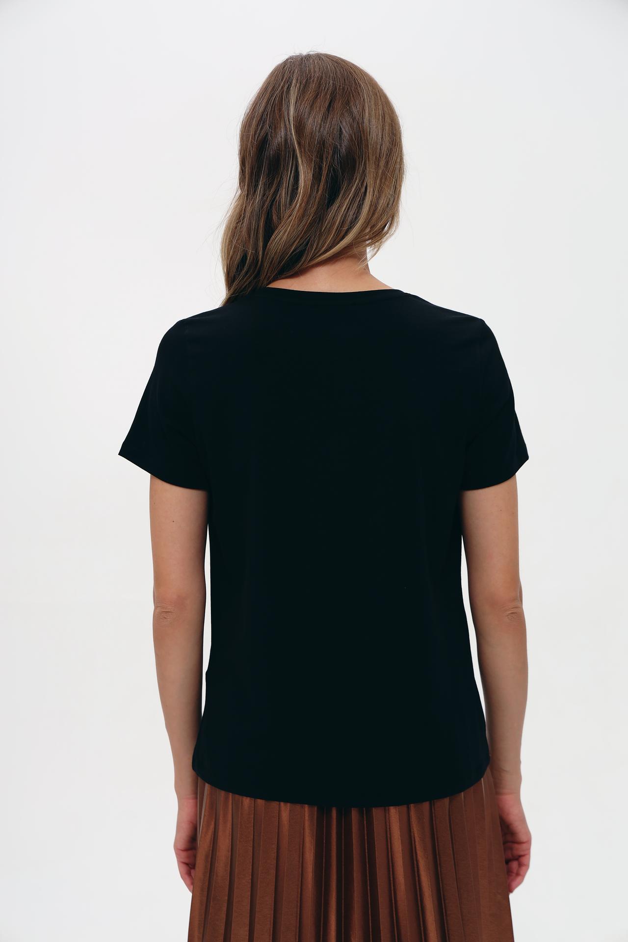 - Универсальность: Черная футболка с пайетками легко вписывается в различные стили. Носите ее с джинсами для создания расслабленного образа или с юбкой-плиссе, как на фото, для более женственного и эффектного вида.