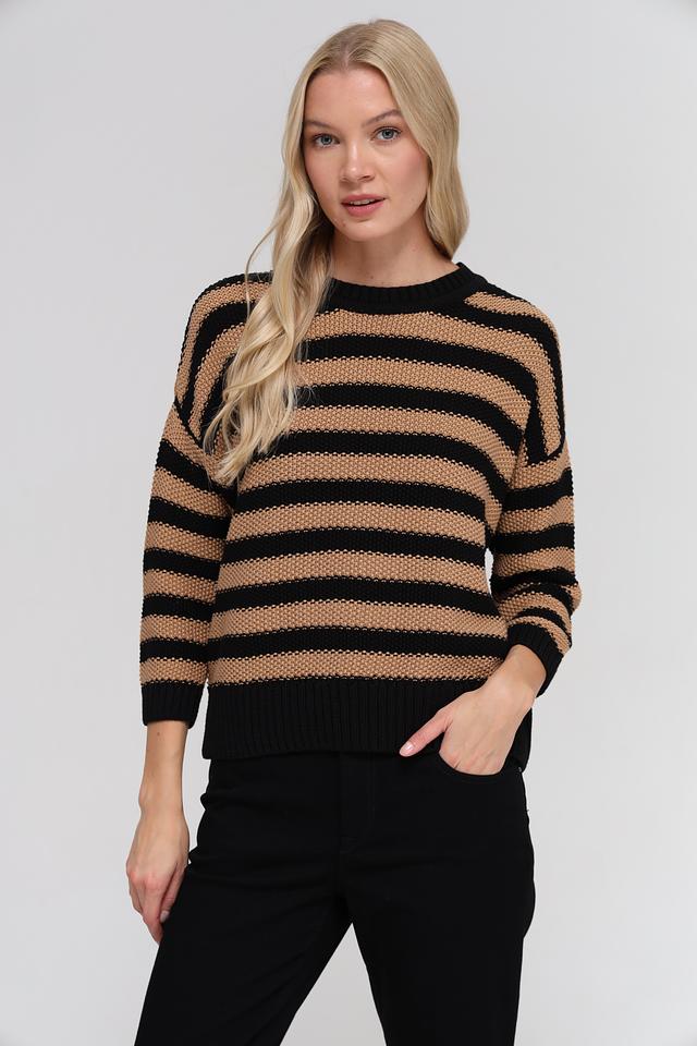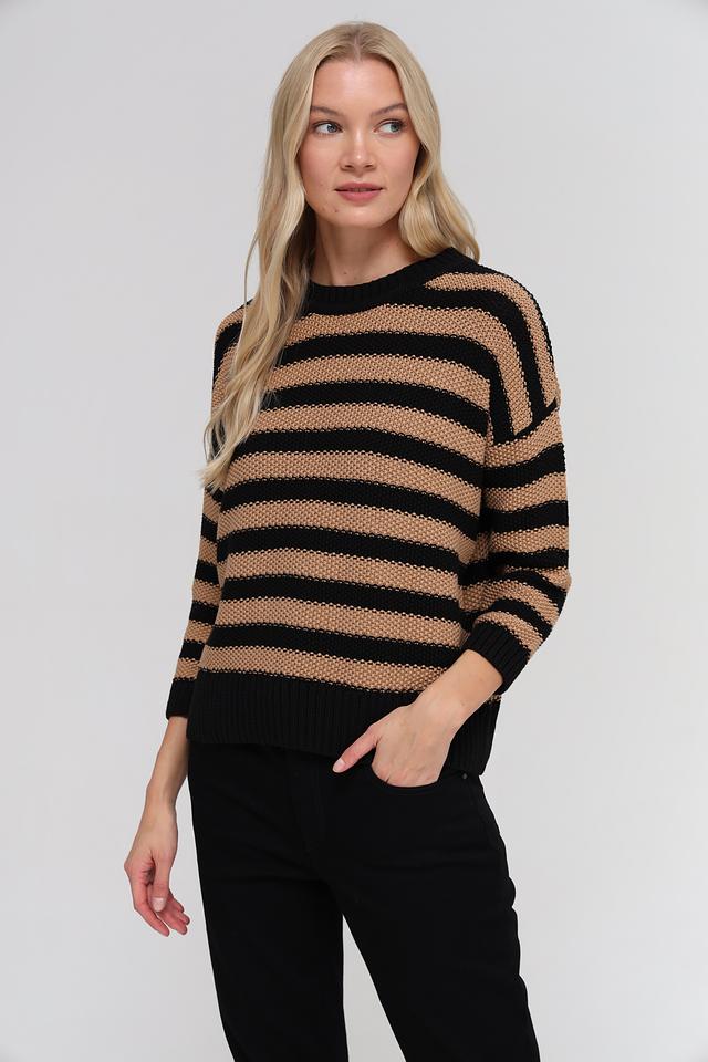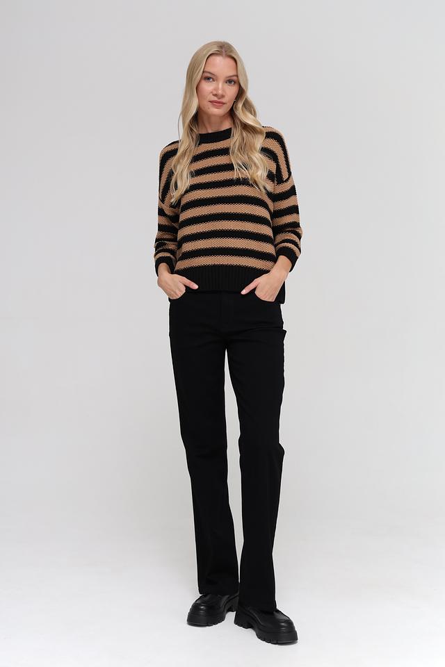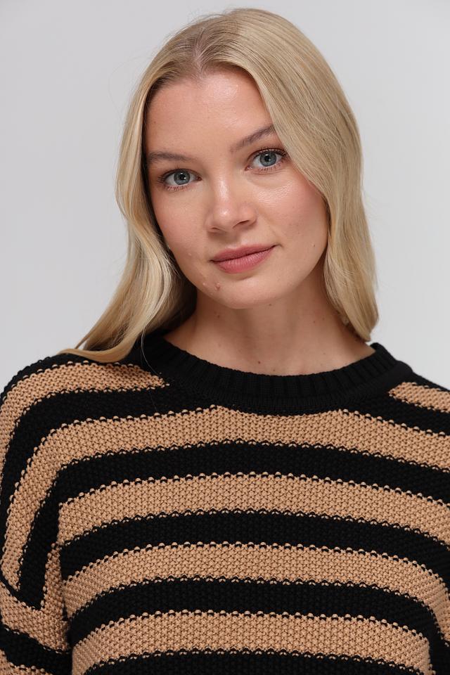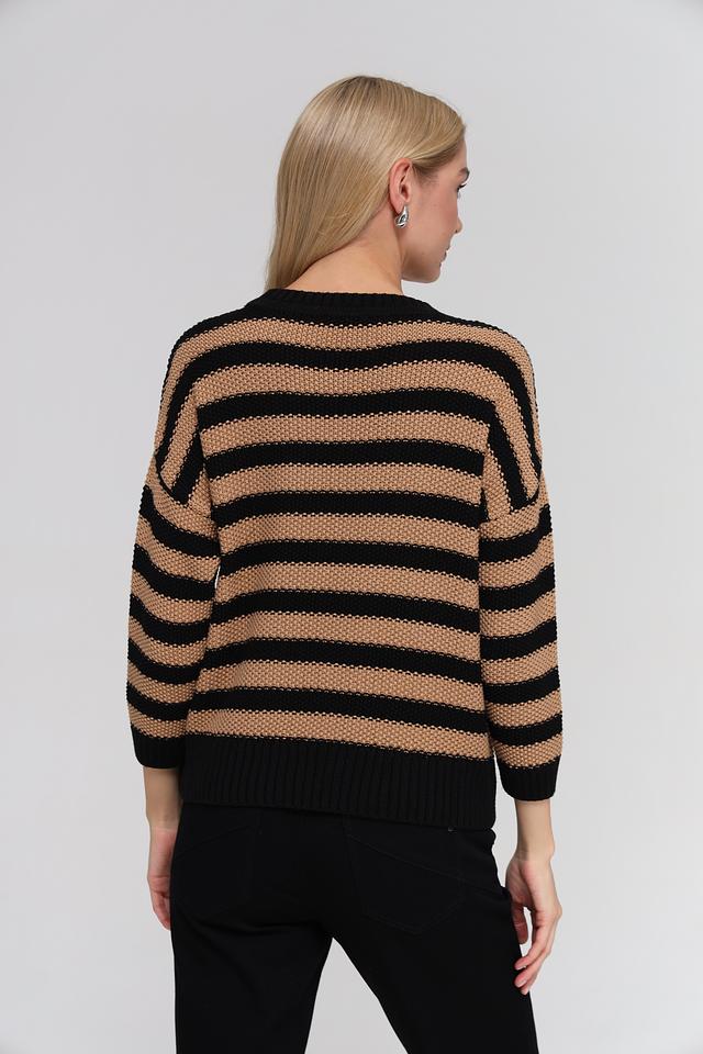 Основной цвет пуловера – бежевый, дополненный широкими чёрными полосами, создающими эффектный контраст. Такое сочетание цветов легко сочетается с различными элементами одежды, позволяя создавать разнообразные образы.