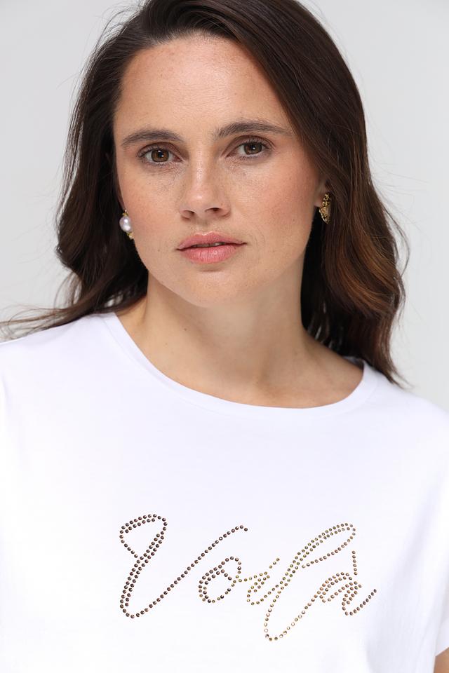 Белая футболка More and More с надписью "Volya", выполненной стразами. Модель имеет прямой крой и короткие рукава, что обеспечивает комфорт и свободу движений. Идеальный выбор для создания повседневных образов. Состав: хлопок 48%, модал 48%, эластан 4%