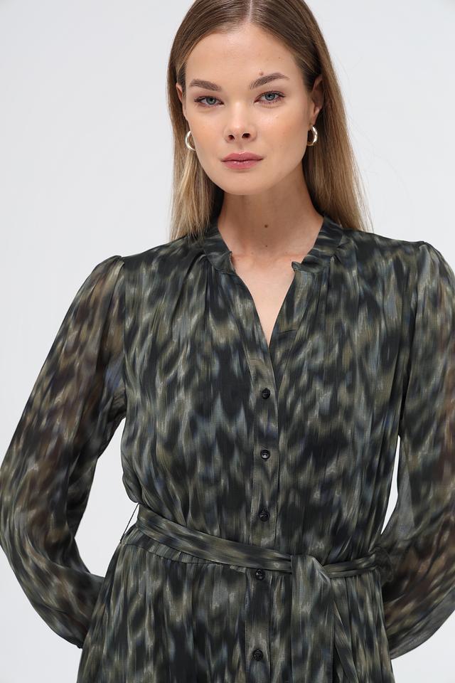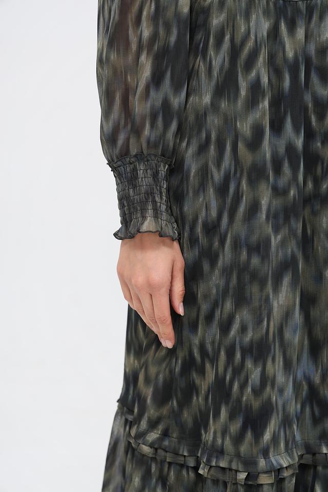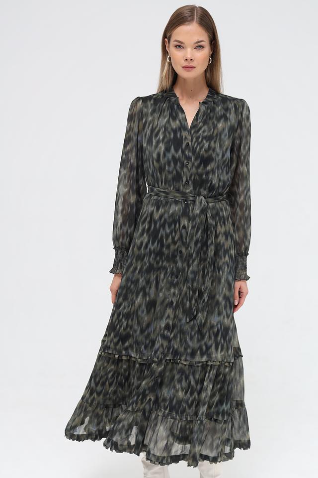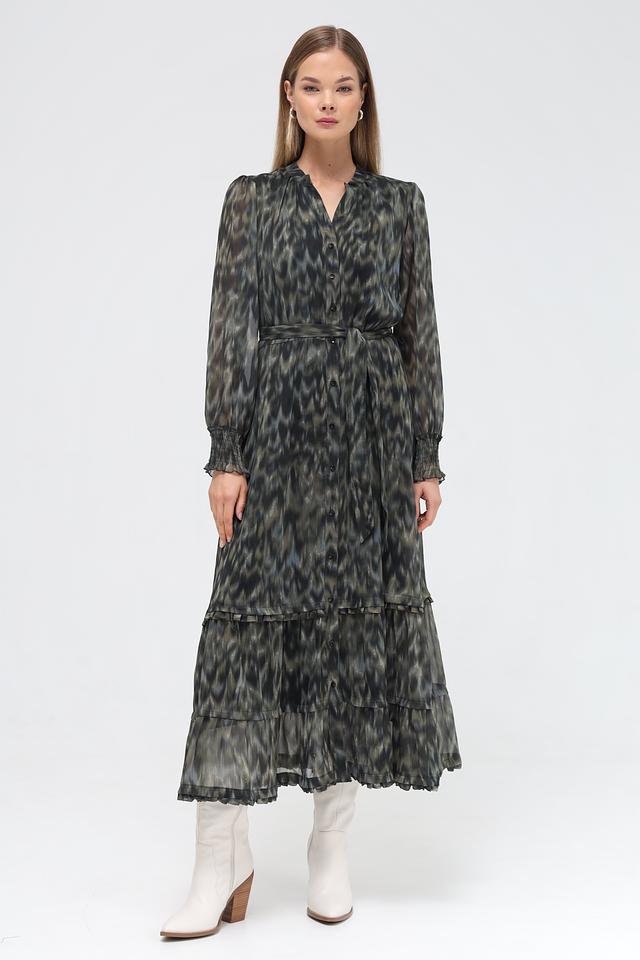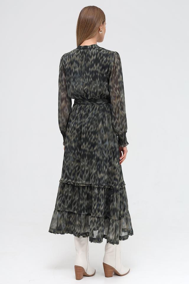 Особенностью модели является оригинальный принт в зелёных тонах, который придает образу неповторимость. Платье имеет V-образный вырез, длинные рукава с манжетами на резинке и завязывающийся пояс, который позволяет подчеркнуть талию. Многоярусный подол добавляет платью воздушности и лёгкости.