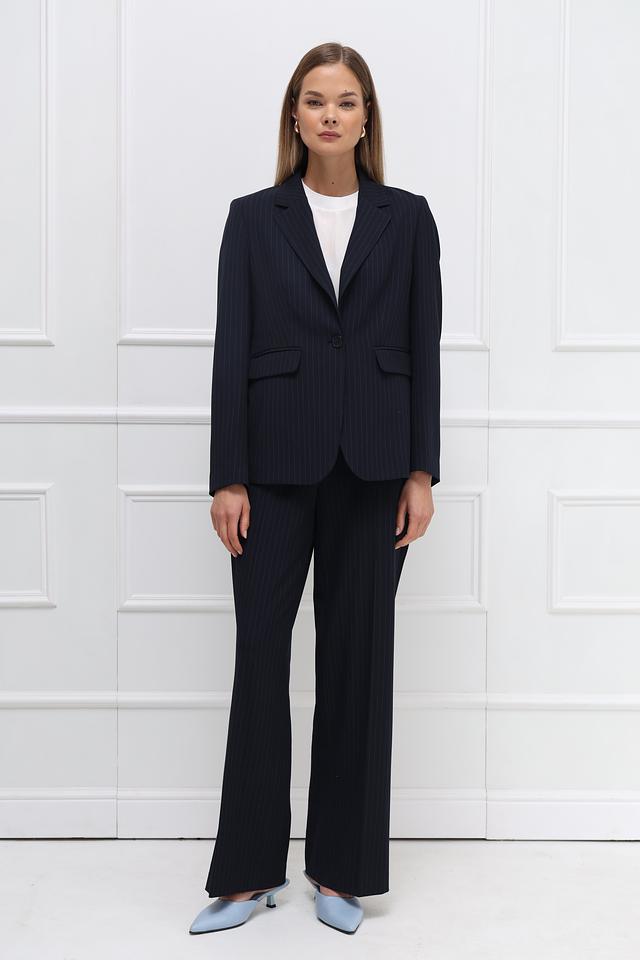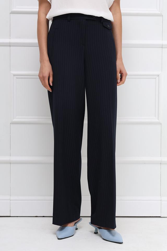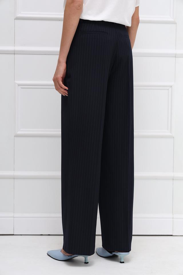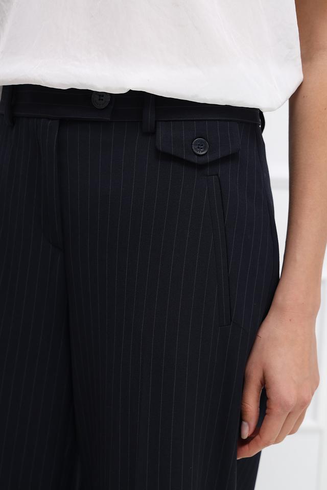 Классические брюки MORE and MORE темно-синего цвета в тонкую полоску. Изготовлены из переработанного полиэстера с добавлением вискозы и эластана, обеспечивающих комфорт и свободу движений. Состав: переработ.полиэстер 63%, вискоза 32%, эластан 5%