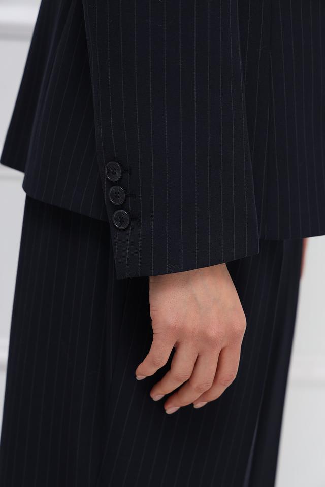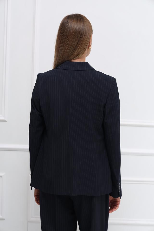 Этот жакет от MORE and MORE выполнен в классическом стиле и станет отличным дополнением к вашему гардеробу. Жакет выполнен в темно-синем цвете с тонкой полоской, что придает ему элегантный и сдержанный вид.