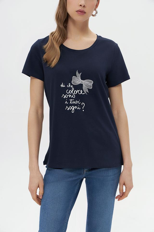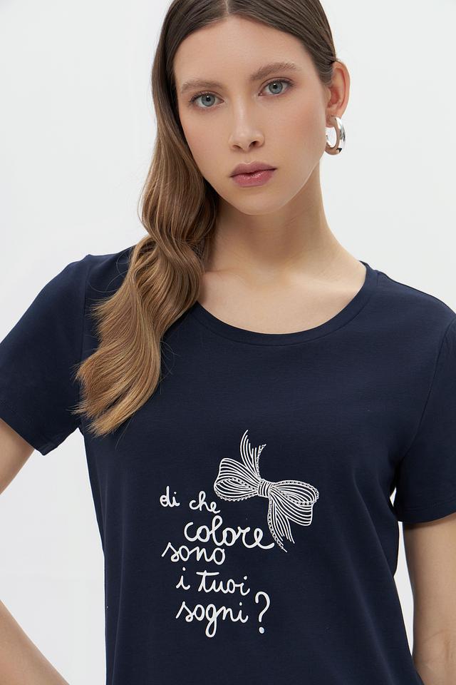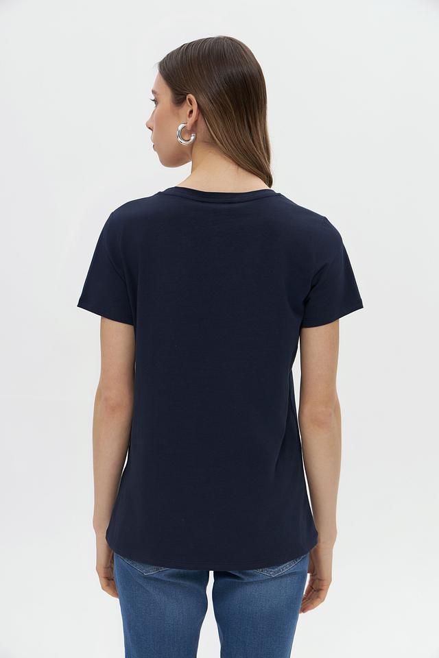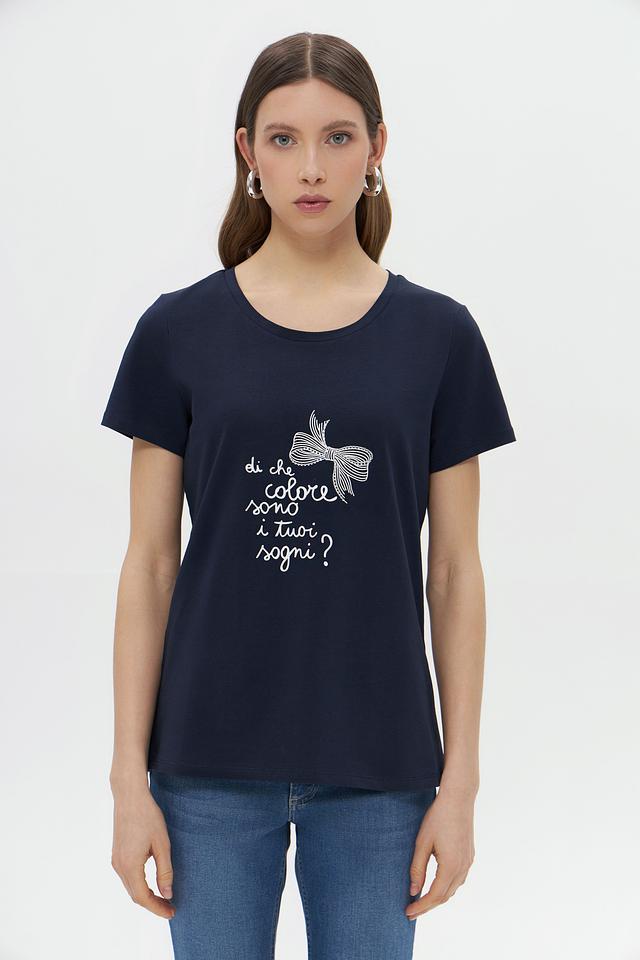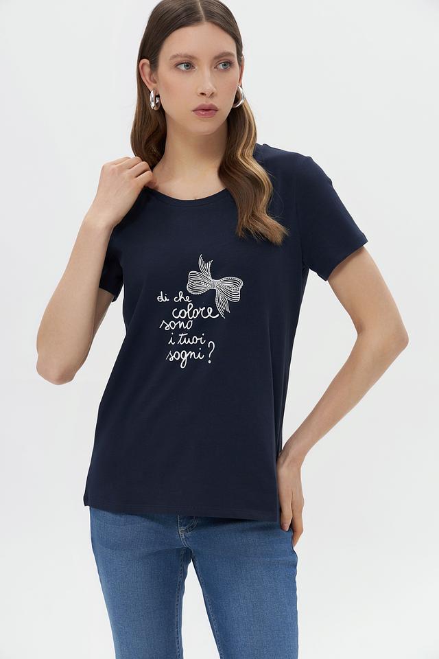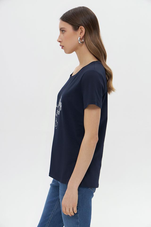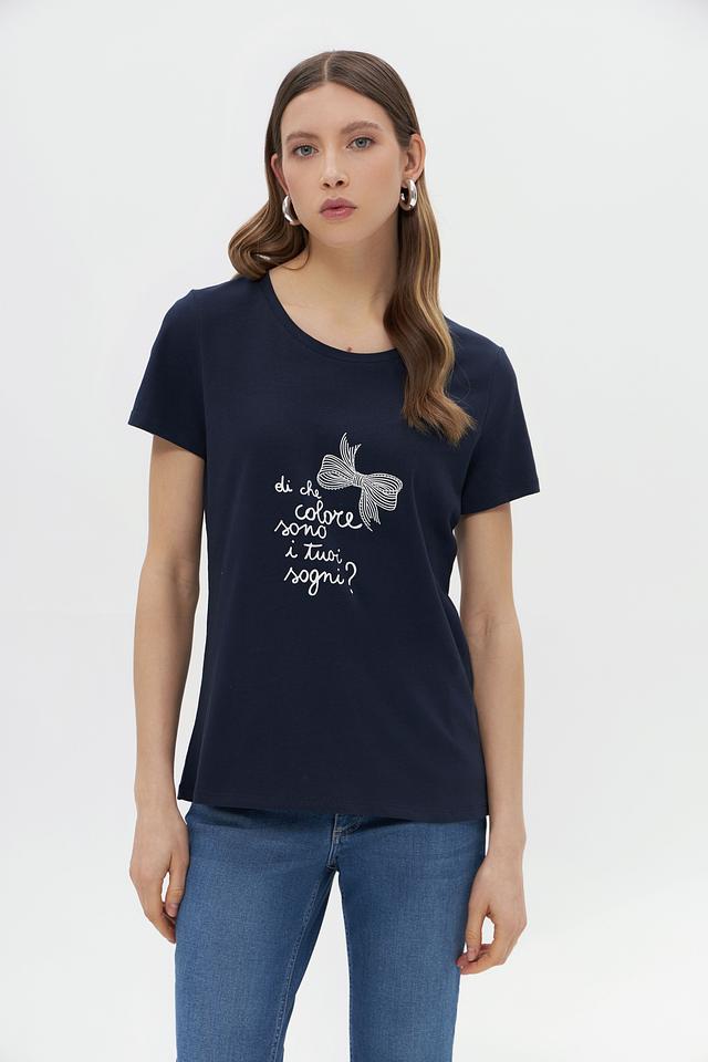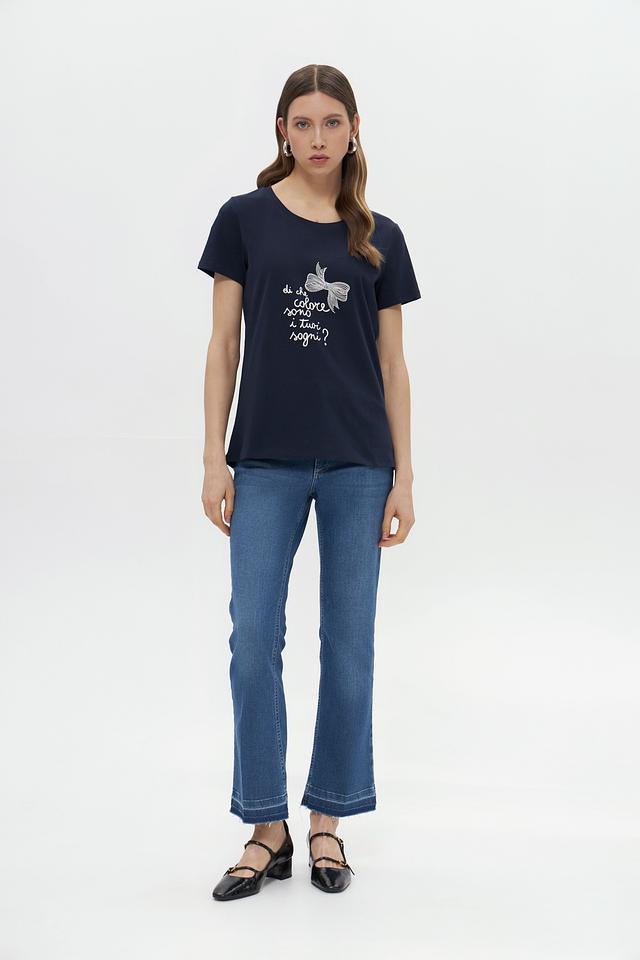 Женская футболка More and More темно-синего цвета, украшена вышивкой в виде банта. Изготовлена из мягкого хлопка с добавлением эластана для комфорта и лучшей посадки. Состав: хлопок 95%, эластан 5%